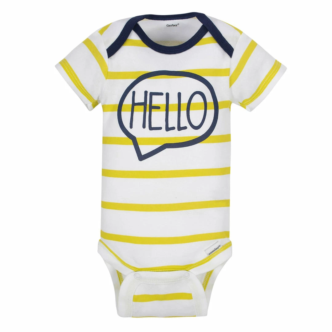 This 8-pack of baby boys’ short sleeve Onesies brand bodysuits will have mom and baby smiling! Themed designs in screenprint and puff print create unique pieces that are lots of fun for little ones to wear. They pair perfectly with other wardrobe favorites, making dressing simple. 100% cotton rib provides a cool, breathable feel. The higher-in-the-front bottom snap closure makes diapering more streamlined. The bodysuits are easier to pull on with the expandable lap shoulder neckline. Machine wash and dry fabric ensures stress-free laundry days!