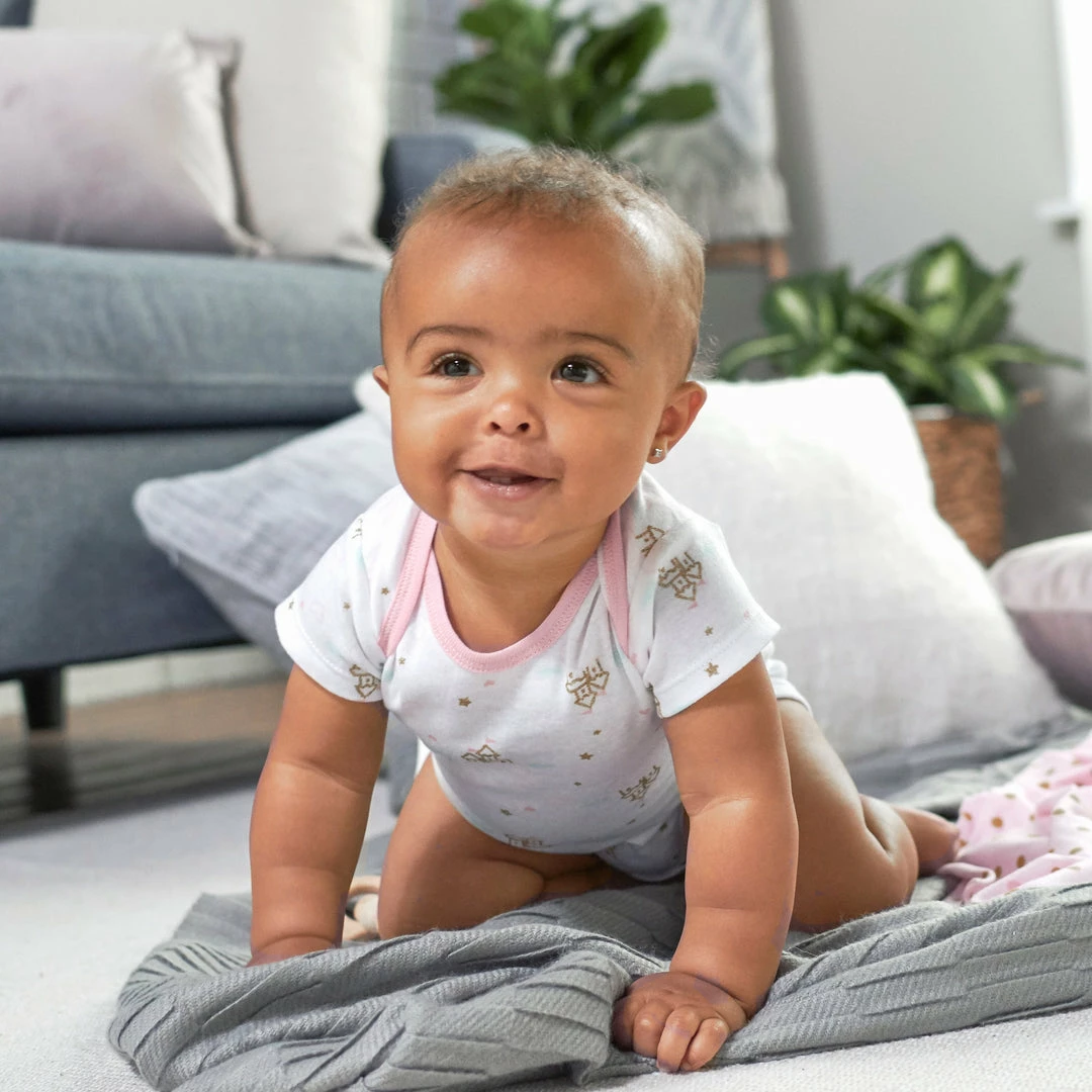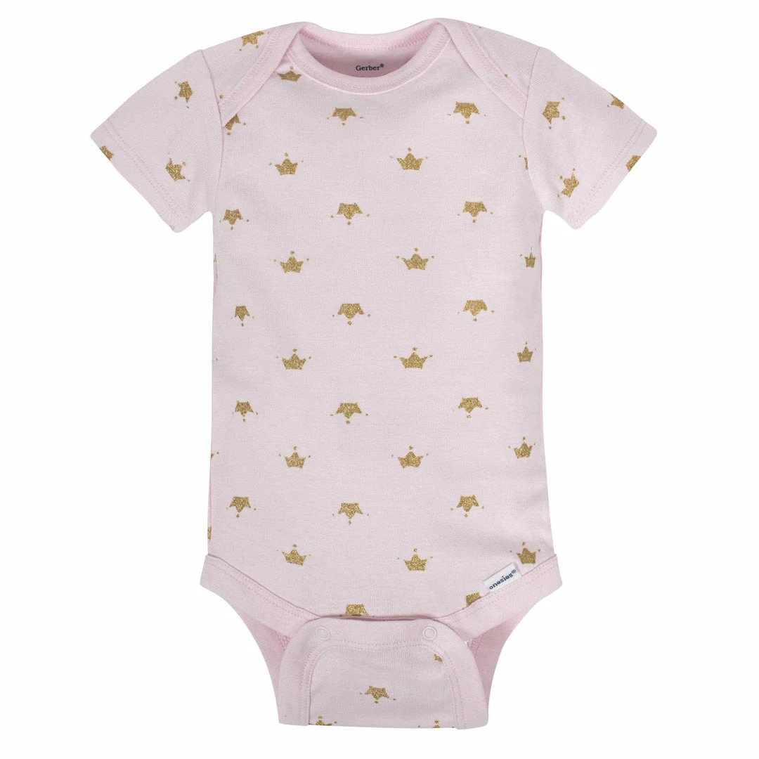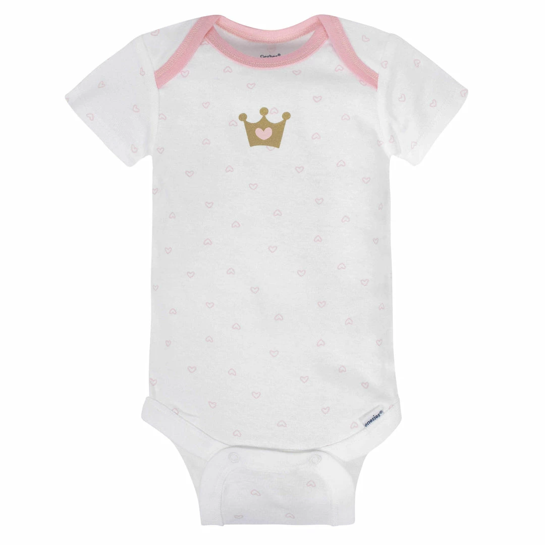 These baby girls Onesies® bodysuits are the perfect starters for adorable outfits! This set includes eight bodysuits. Theyre perfect to mix and match with her favorite pants, caps, and accessories to create fun and unique outfits. Each bodysuit is made with cotton to provide comfort and breathability. Such cotton fabric is perfect against babys delicate skin. The Onesies® bodysuits feature an expandable lap shoulder neckline that keeps wardrobe changes at their simplest. The bottom snap enclosure is positioned higher in the front to increase the ease with which diapers may be changed. These baby girls bodysuits are machine washable and dryable to keep laundry day a breeze. This set makes a thoughtful gift for any baby girl you know and love. Its sure to be appreciated by both baby and parents alike. Perfect for layering or worn all on their own, these bodysuits are a great addition to her wardrobe.