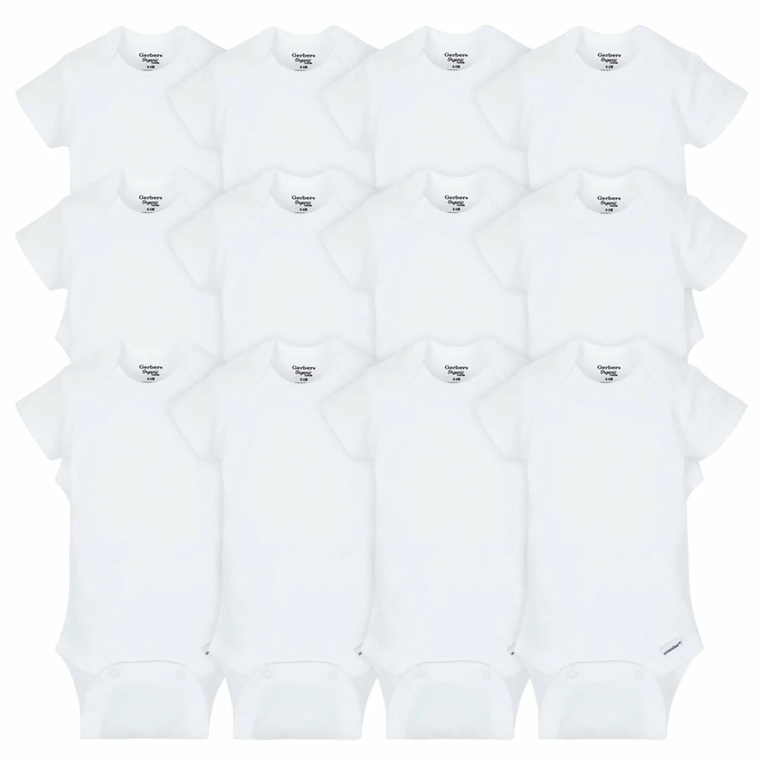 This Grow-With-Me bundle of organic white Onesies® bodysuits is the perfect addition to any baby’s wardrobe. They are made with 100% cotton with organic fibers, which is a safe, soft fabric that is ideal for baby’s sensitive skin. They are the perfect apparel to use for layering to keep baby warm, but they are also great worn all on their own! The bodysuits are designed with you in mind, as the bottom snaps are higher in front to provide for easy diaper and outfit changes. The short sleeves lend well for layering when the weather is colder. Plus, short sleeve bodysuits are easy to clean! They are machine washable and dryable, so laundry isn’t quite as much of a hassle. These white bodysuits truly are a must-have for baby, which makes them a great shower gift! They’re safe, practical, comfortable, and down-right cute! This pack includes three separate 4-packs of bodysuits in sizes NB, 0-3M, and 3-6M. Gerber® offers high-quality products that parents can trust to bring baby comfort and style at a great value.