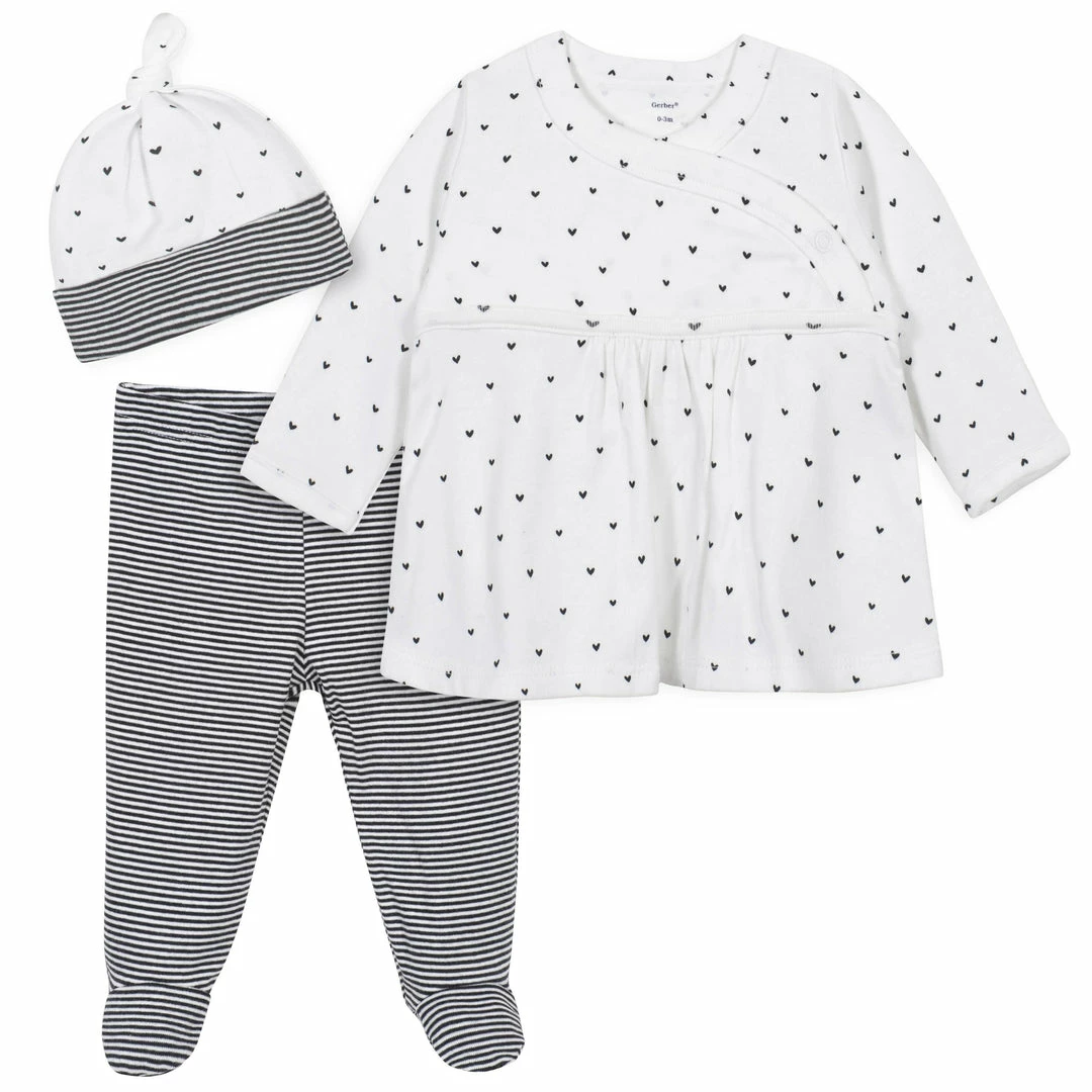 This three-piece set is a wonderful and comfortable outfit that baby is sure to love! This set includes one shirt, one footed pant, and one cap. Each item is made with a soft blended fabric of cotton and spandex. Its a safe and soft material, perfect for babys delicate skin. This precious baby shirt features a kimono-style neckline so that the garment may easily slip over babys head. The footed baby pants feature a gentle elastic waistline that makes putting these pants on and taking them off as simple as possible. These baby girl pants are footed for warmth, which makes them convenient and comfortable for cooler temperatures. The footed pant eliminates the need for baby socks which keeps this baby girls outfit simple and easy. The baby hat features a soft cuff to add comfort to the outfit. This baby girls cap also features a double knot to add style and subtle flair to this adorable baby girls outfit. This cute three-piece set is as easy to clean as it is attractive. Each item may be machine washed and machine dried for parents or caretakers convenience. Gerber understands that busy parents dont have time to handwash clothing. This girls outfit is perfect to wear out on the town as its stylish and fun. Its also perfect to wear around the house as it is extremely comfortable! This three-piece baby girls outfit makes an excellent gift for any baby girl you know and love! Bring this set as a gift to the next baby shower you attend for an adorable, thoughtful, and practical gift. Baby is sure to love how comfy this shirt, footed pant, and cap set is and, parents are sure to love how adorable their baby girl will look while wearing this set! The cute pattern is stylish, attractive, and makes this outfit something truly special. Supply baby with nothing but the best! Gerber offers products of high value with outstanding quality. Gerber makes products that parents can trust to be safe and comfortable for their children.