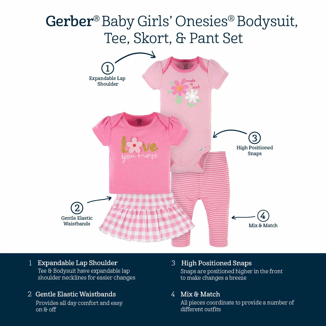 Be the first to review “Hot Sale 🔔 Gerber® 4-Piece Baby 👧 Girls ☀️ Summer Blossom Onesies® Bodysuit, Tee, Skort & Pant Set See What’s New 🔥” Cancel reply