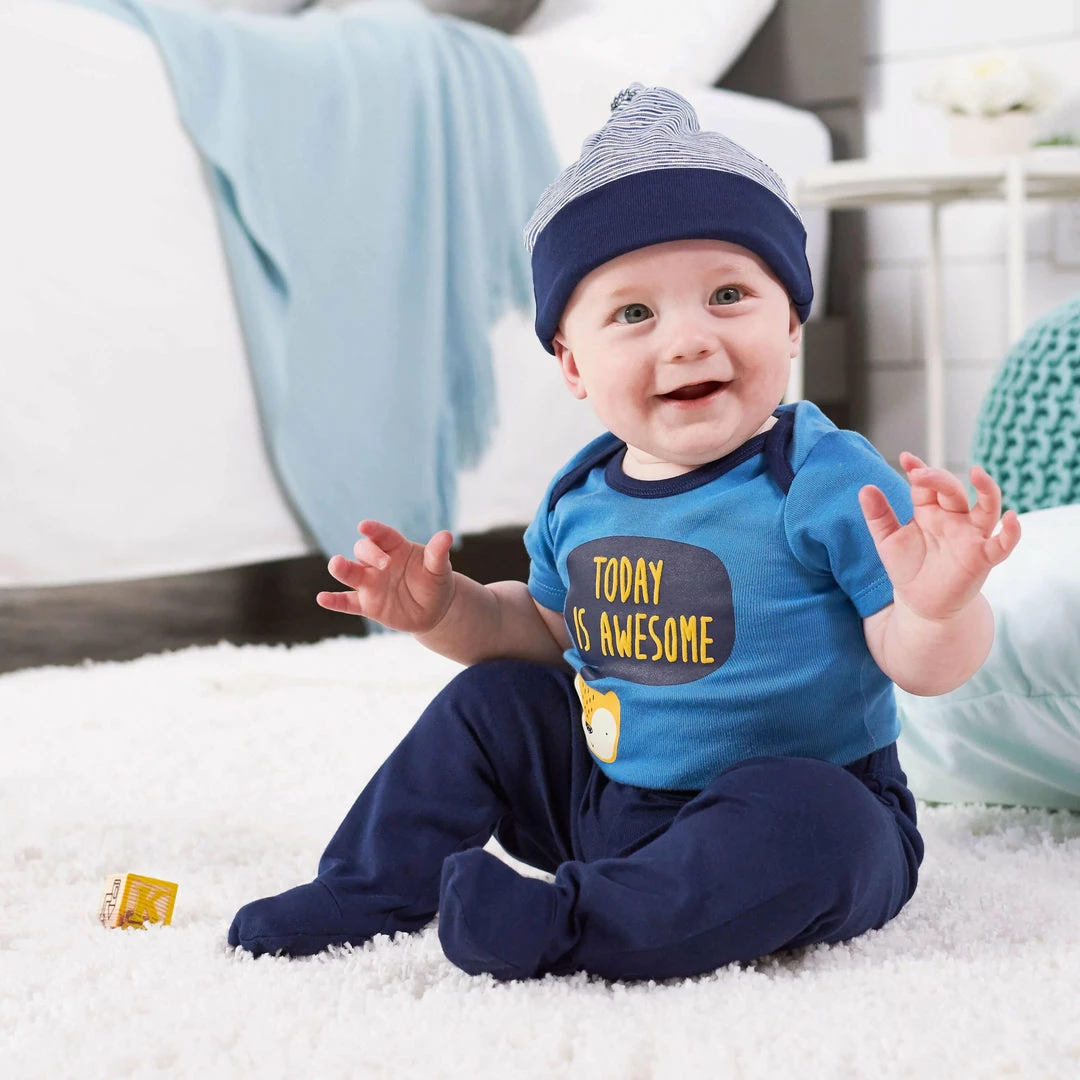 This 4-piece set is seriously handsome! The set includes one Sleep ‘n Play, one Onesie, one pant, and one cap. Made from cotton rib, this set is cute, comfortable, and easy to clean. With two complete outfits, this set provides attire for both day and night.