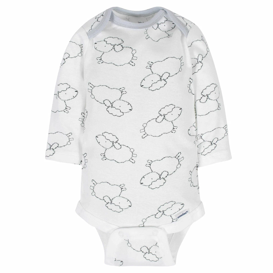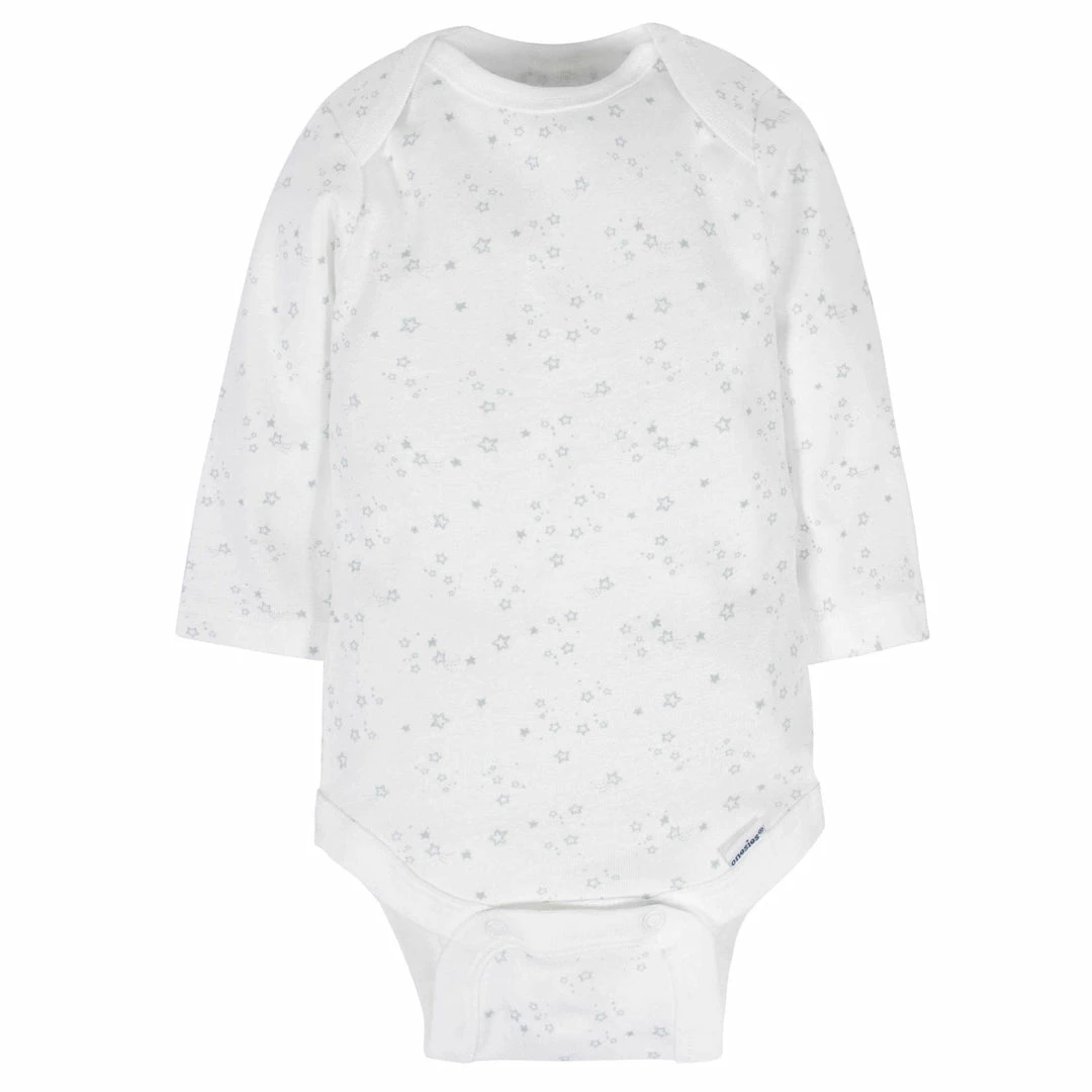 These neutral baby long sleeve Onesies® bodysuits are delightfully soft and incredibly cute! This set includes six Onesies® bodysuits. Theyre perfect to mix and match with babys favorite pants, caps, and accessories to create fun and unique outfits. Each bodysuit is made with cotton to provide comfort and breathability. Such cotton fabric is perfect against babys delicate skin. The Onesies® bodysuits feature an expandable lap shoulder neckline that keeps wardrobe changes at their simplest. The bottom snap enclosure is positioned higher in the front to increase the ease with which diapers may be changed. These unisex baby bodysuits are machine washable and dryable to keep laundry day a breeze. This set makes a thoughtful gift for any little one you know and love. Its sure to be appreciated by both baby and parents alike. Perfect for layering or worn all on their own, these bodysuits are a great addition to babys wardrobe.