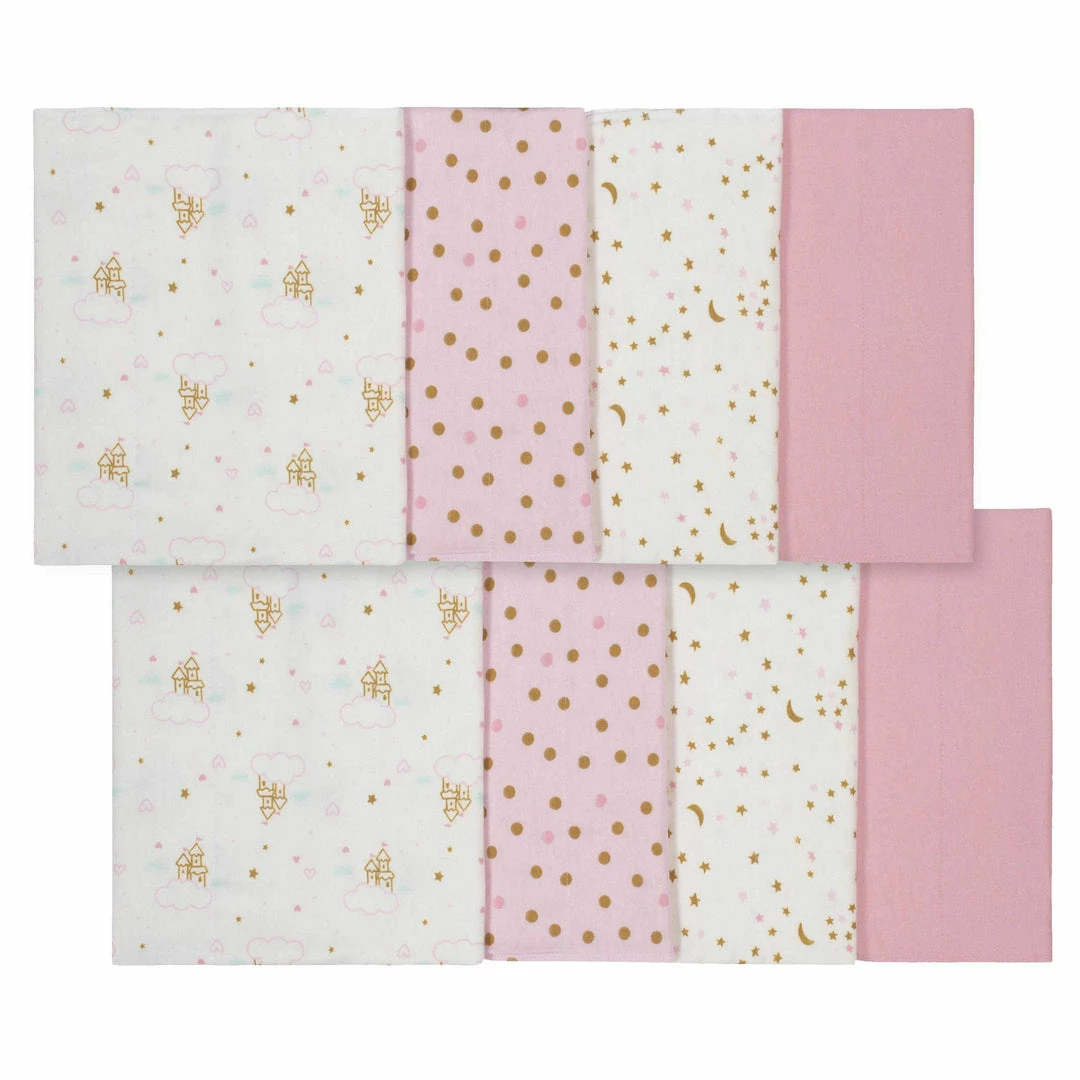 These baby girls flannel burp cloths are the ideal accessory to keep feeding time fun! This pack includes eight burp cloths, each made with a soft cotton flannel fabric. This flannel fabric is soft and safe against babys skin. Its an absorbent fabric, perfect to catch and clean messes from baby. These burp cloths are machine washable and dryable for your convenience. After feeding time is over and each burp cloth is spent, they may be cleaned with the utmost ease. This assorted pack features adorable prints, patterns, and colors to keep feeding time fun and fashionable! Theyre the perfect size to throw in the diaper bag to keep clean when you are on the go. These cloths are great not only to burp baby but also to keep babys face clean from dribbles. Bring them to the next baby shower you attend as an adorable, practical, and thoughtful gift!