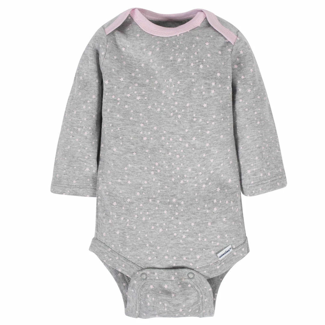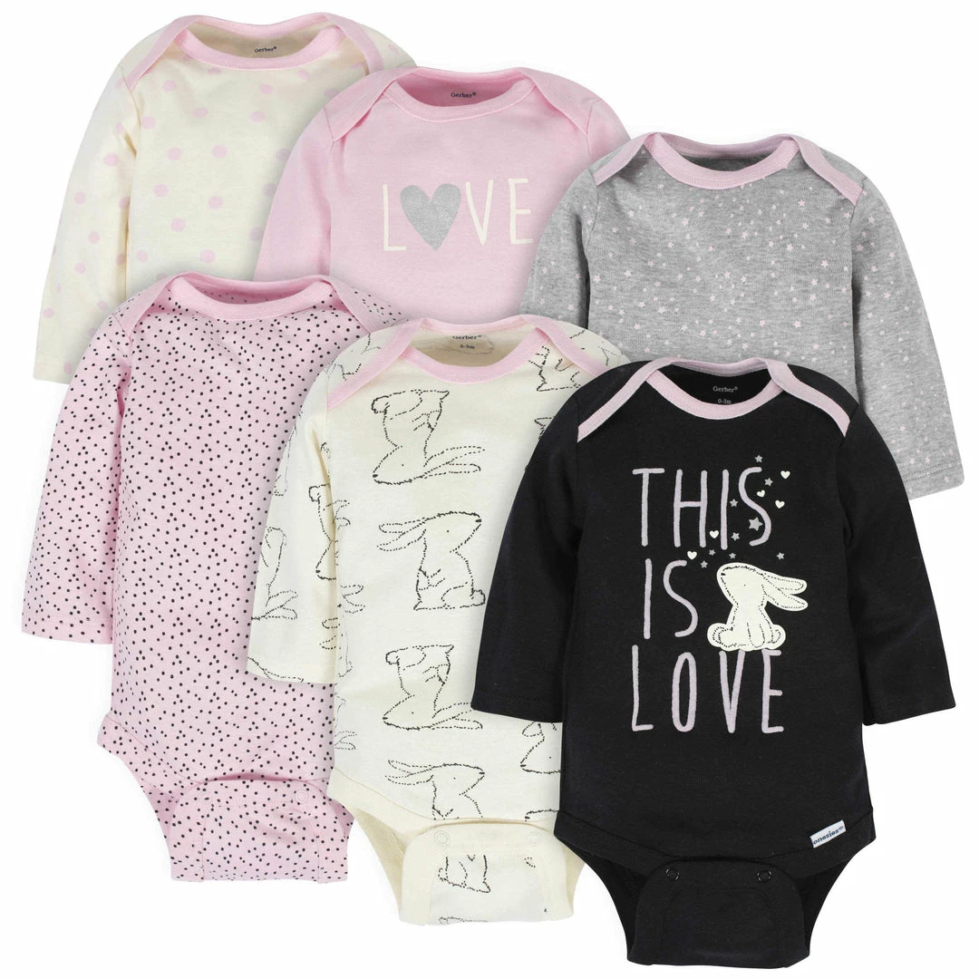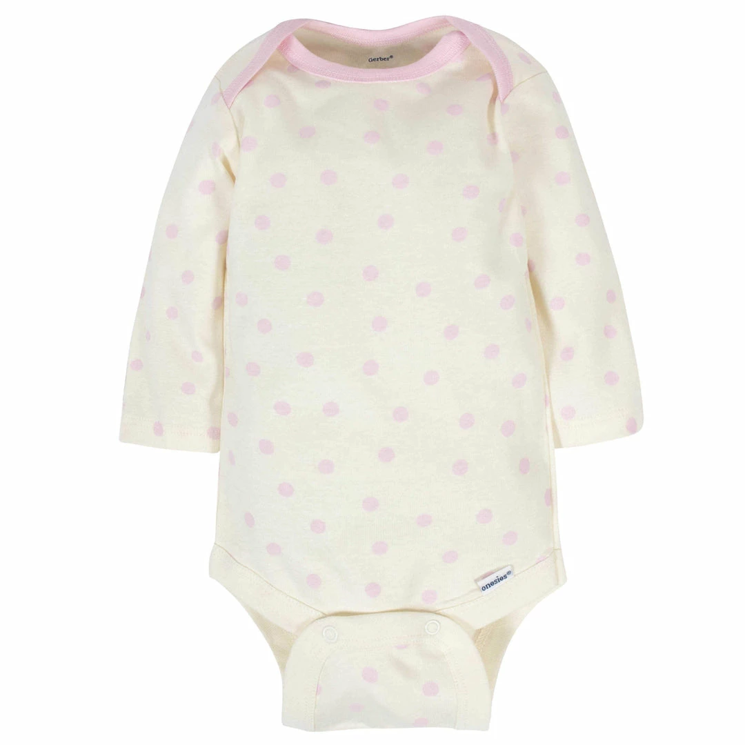 These baby girls long sleeve Onesies® bodysuits are the perfect starters for adorable outfits! This set includes six bodysuits. Theyre perfect to mix and match with her favorite pants, caps, and accessories to create fun and unique outfits. Each bodysuit is made with cotton to provide comfort and breathability. Such cotton fabric is perfect against babys delicate skin. The Onesies® bodysuits feature an expandable lap shoulder neckline that keeps wardrobe changes at their simplest. The bottom snap enclosure is positioned higher in the front to increase the ease with which diapers may be changed. These baby girls bodysuits are machine washable and dryable to keep laundry day a breeze. This set makes a thoughtful gift for any baby girl you know and love. Its sure to be appreciated by both baby and parents alike. Perfect for layering or worn all on their own, these bodysuits are a great addition to her wardrobe.