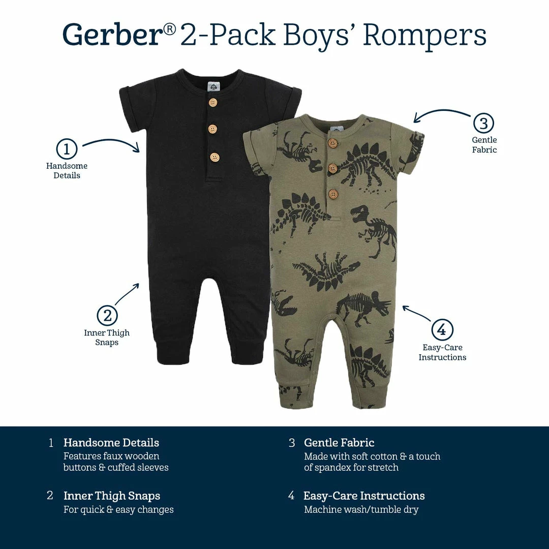 Be the first to review “Wholesale 🛒 Gerber® See What’s New 2-Pack Baby Boys Fossils & Black Short Sleeve Rompers 🔥” Cancel reply