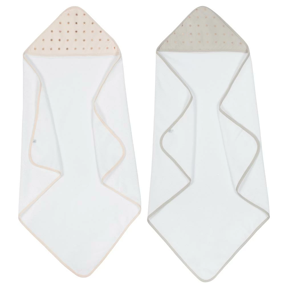 Bring a fun twist to the bathtime routine with this 2-pack of neutral baby hooded towels from Just Born®. The classic colors and adorable artwork will bring smiles to your baby boy or girl after a bath. Each towel is made with 100% cotton muslin and terry fabrics for a soft and soothing feel on your little one’s delicate skin. The cozy hood on the towel keeps chills at bay as you finish drying. Baby will be warm and comfortable as you prepare for bedtime. The edges are finished to keep these towels looking newer for longer. The stitching ensures that the towels won’t fray, even after frequent use. No-fuss laundry days are guaranteed thanks to the easy care, machine wash and dry fabric. This hooded towel set is ideal for gifting to a special little one.