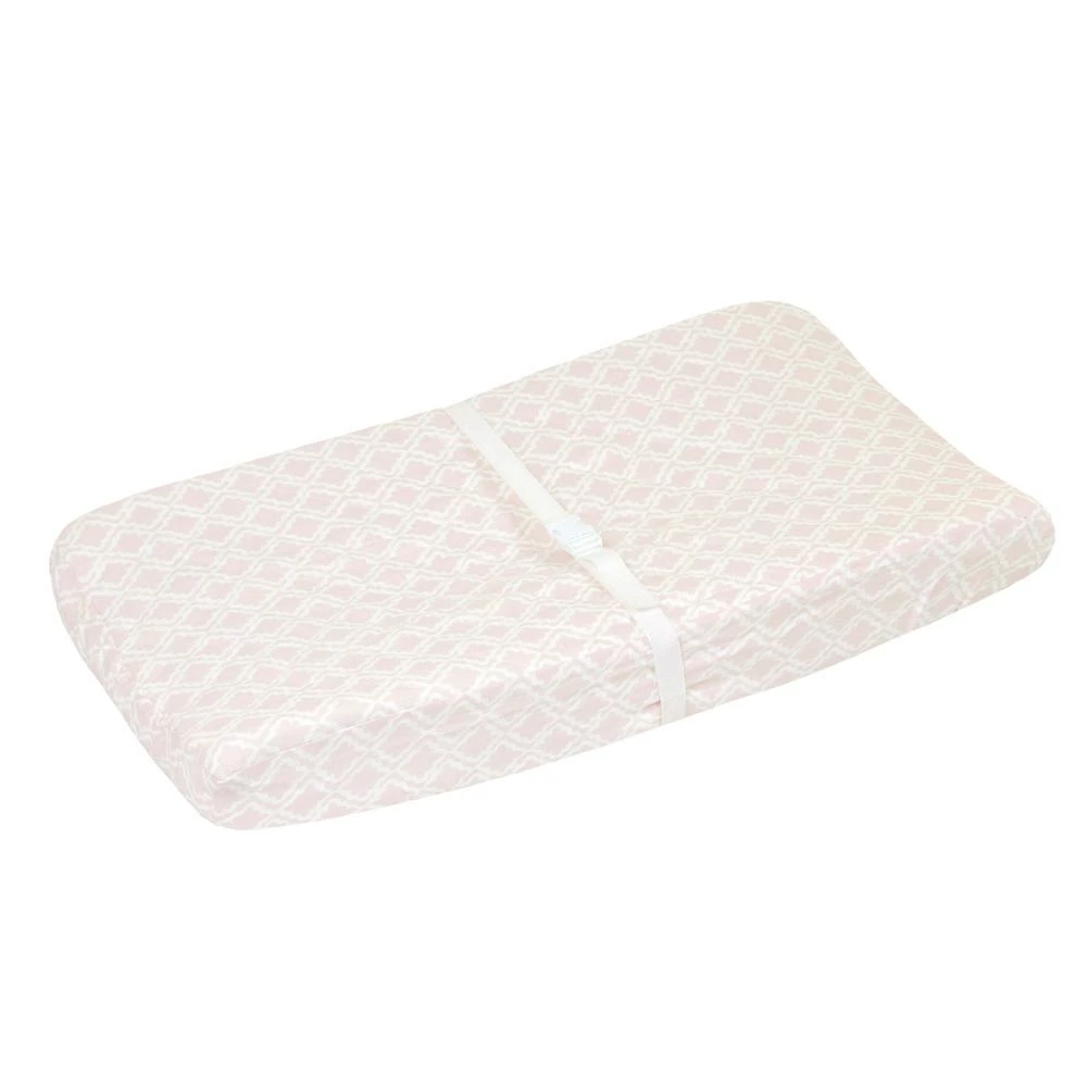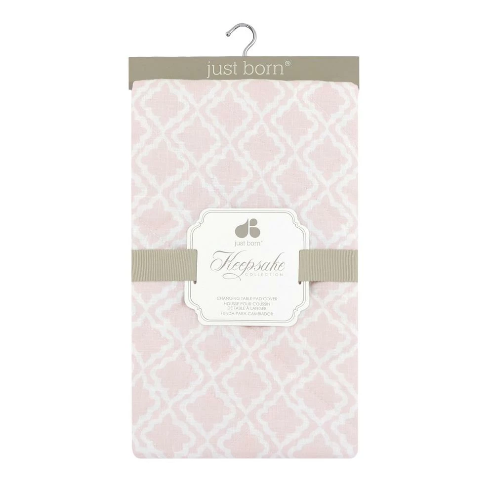 Create an enchanting nursery for your little princess with the Just Born Keepsake Trellis Changing Pad Cover. The luxurious quilted linen cover features the iconic interlocking pattern, in a beautiful blush pink color for a romantic look and feel.