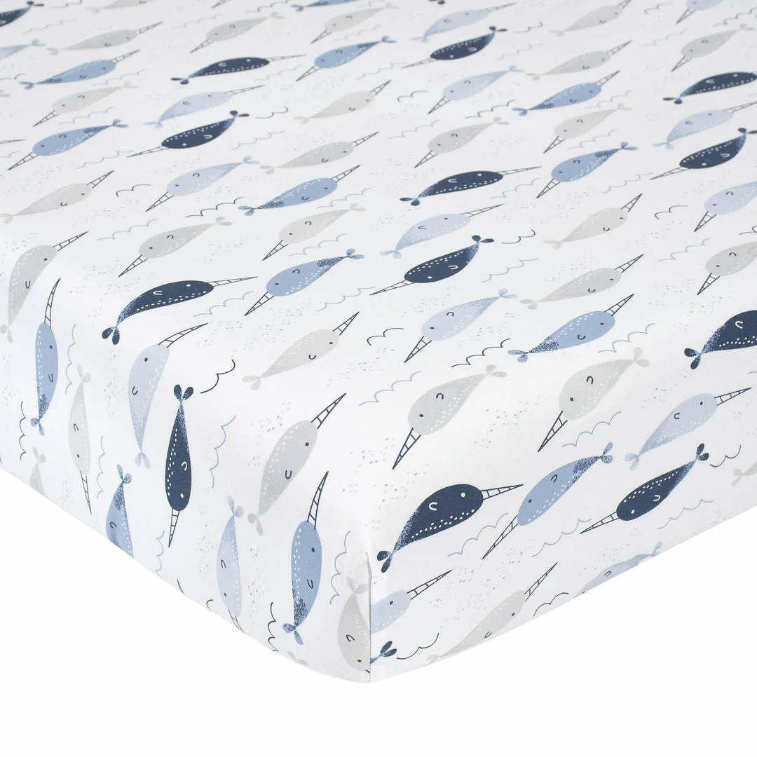 Baby will find peaceful slumber atop this fitted crib sheet from Just Born®. The blue narwhal design adds a sophisticated ambiance to his nursery. Collect the coordinating quilt, mobile, blanket, crib skirt, changing pad cover, and security blanket from the Dream Collection for a complete look. This soft cotton sheet fits standard size cribs, promotes safe sleep, and is machine washable and dryable.