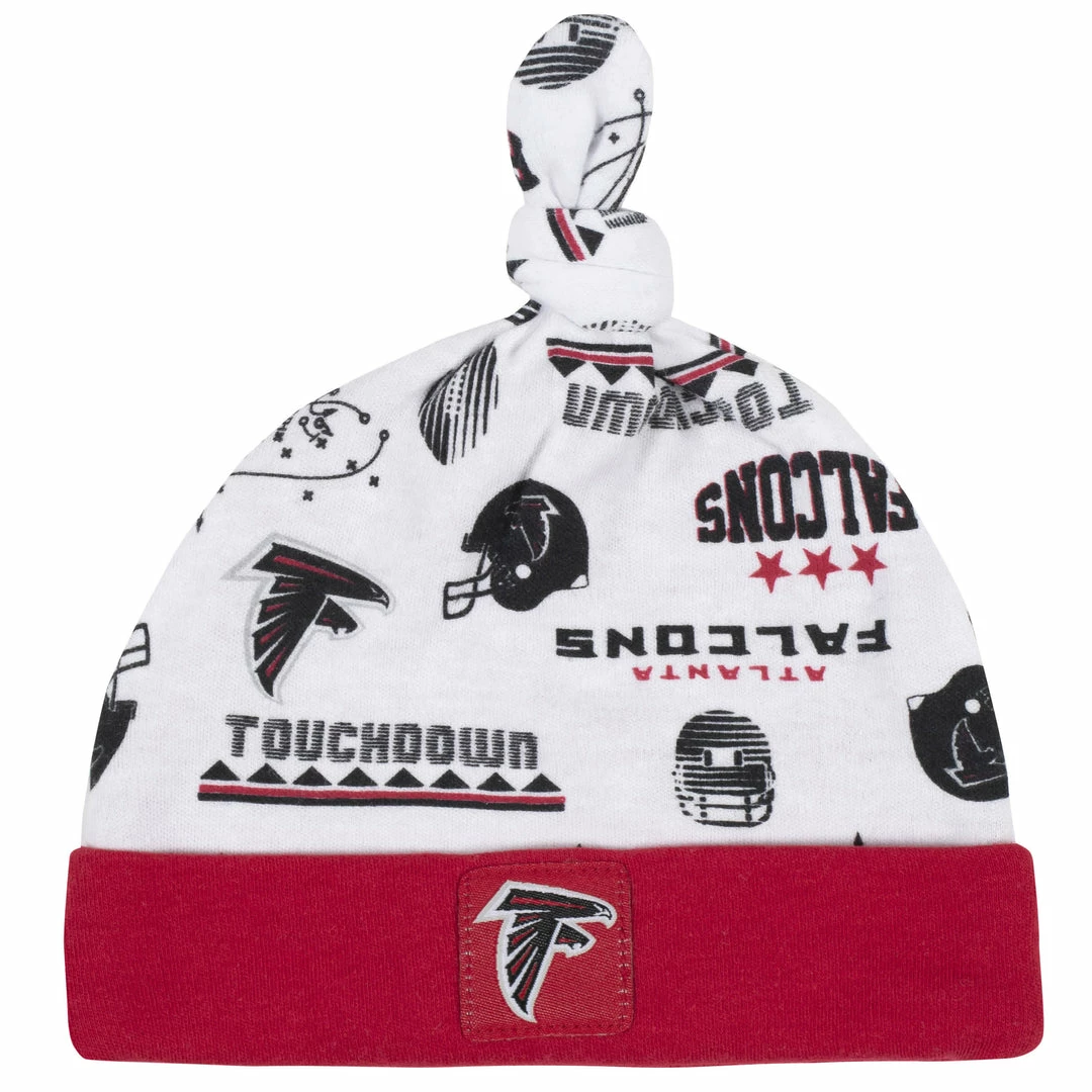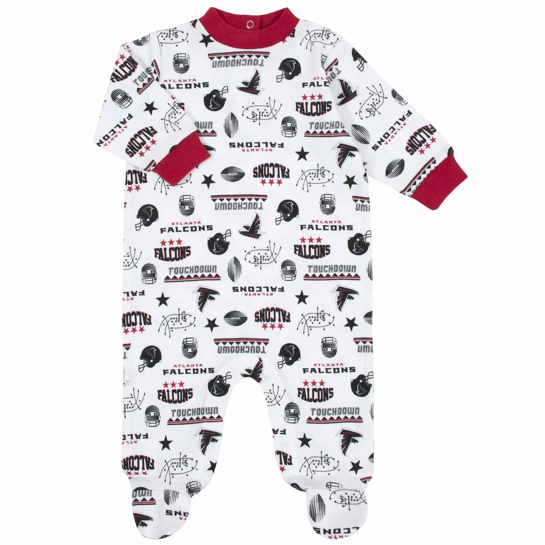 Boast your babyโs Falcons pride with this 3-piece bodysuit, Sleep ‘n Play, and cap set! This officially licensed NFL outfit is made with a soft cotton and polyester interlock to keep baby comfortable and content all game long. The bodysuit features an expandable lap shoulder neckline with high-positioned bottom snaps to keep changes quick and simple. It also has a bright and bold, screenprint team logo front and center. The Sleep ‘n Play boasts a colorful print of your teamโs logos and helmets and features inner thigh snaps and a back placket for comfort and convenience. The knotted cap features a soft cuff for comfort and will keep your little one snuggly warm in cool weather This outfit is machine washable and dryable. It includes one bodysuit, one cap, and one Sleep ‘n Play.