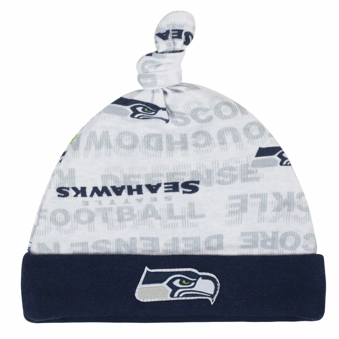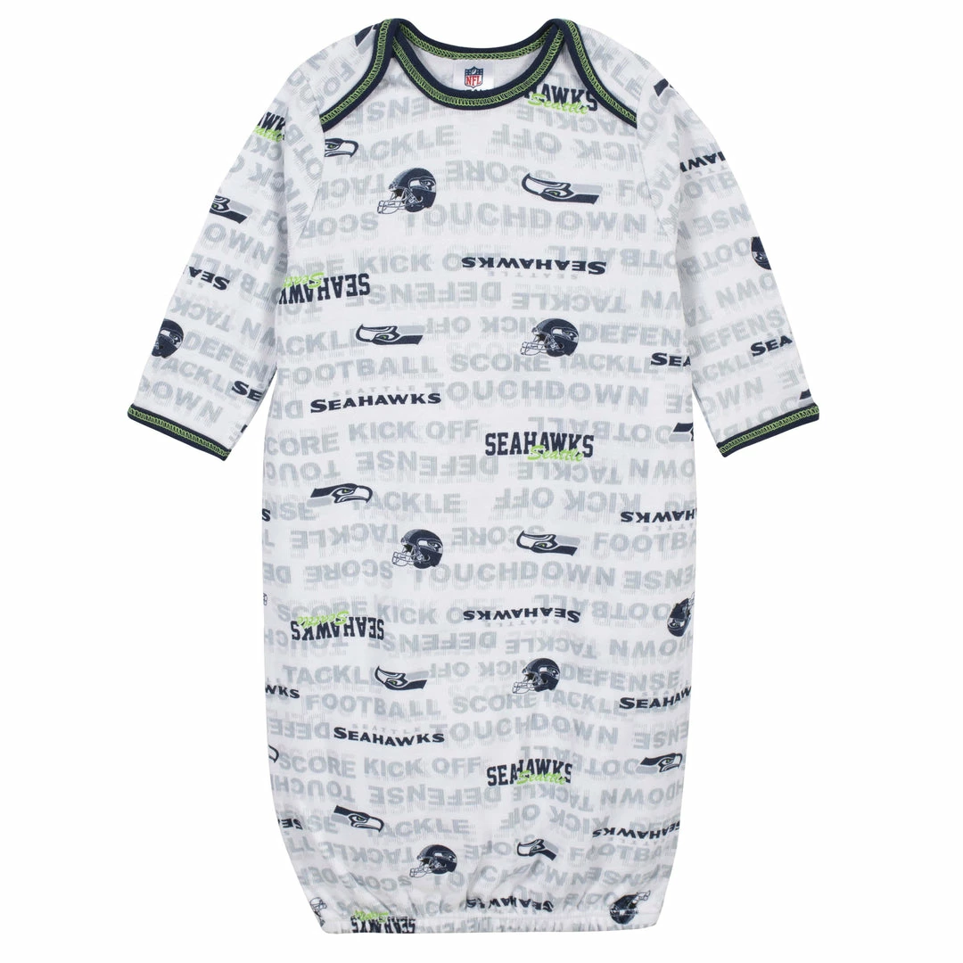 Show off your favorite little sports fan with this baby boysโ officially licensed Seattle Seahawks 3-piece set! You’ll receive one short sleeve bodysuit, one gown, and one matching cap. That winning Seahawks logo stands out with the screenprint and embroidery design! A matching cap creates the perfect accessory to show off those proud team colors. The artwork on the gown is team-specific and provides a perfect choice for keeping the game time spirit up even during bed-time! Mom will appreciate the bodysuit’s higher-in-the-front bottom snap closure that makes it easy to change diapers and the mitten cuffs on the gown that protect delicate skin from scratches. Machine wash and dry fabric make laundry day more convenient for mom!