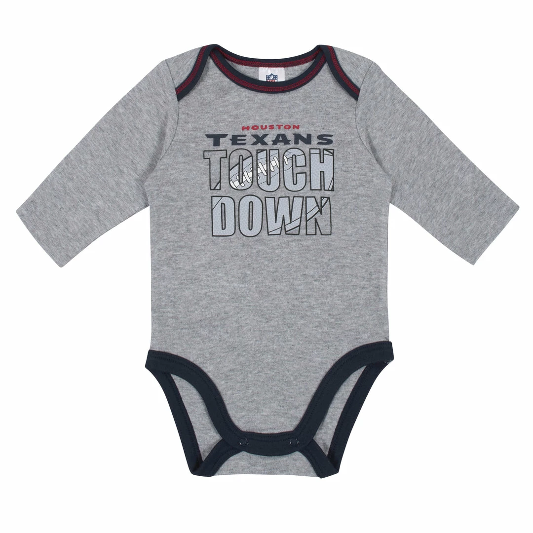 Get your little boy ready to take the field with this baby boys’ officially Houston Texans long sleeve bodysuit 2-pack set! Gridiron-inspired screenprint with contrast coverstitch frames the Steelers logo to perfection. The cotton/poly blend interlock ensures he’s feeling his best from the opening kickoff to the final seconds of the game. An expandable lap shoulder neckline makes it easy for mom to dress him out on game days. A higher-in-the-front bottom snap closure simplifies diaper duty. Laundry day stays hassle-free with these easy care items!
