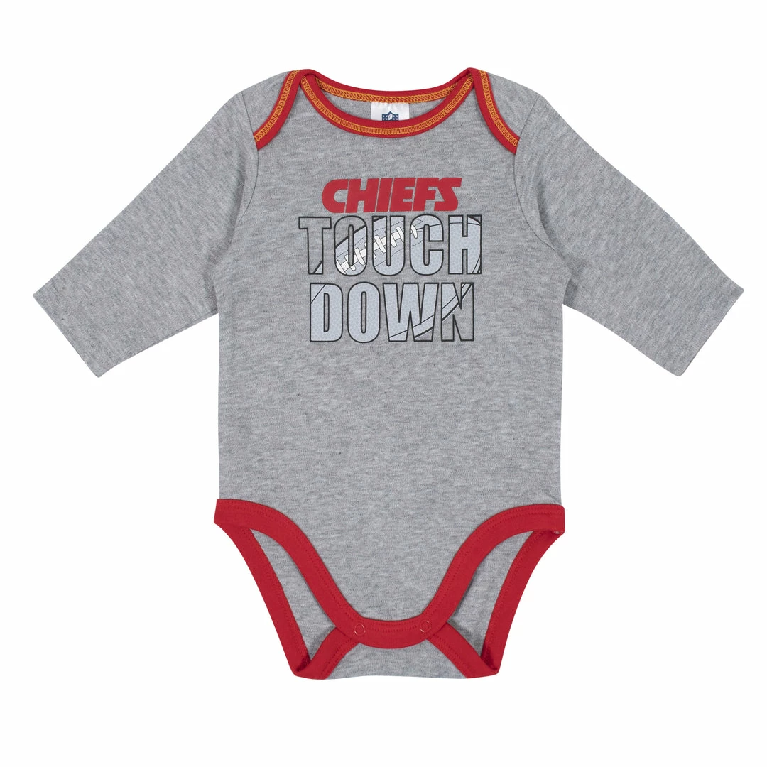 Get your little boy ready to take the field with this baby boys’ officially licensed Kansas City Chiefs long sleeve bodysuit 2-pack set! Gridiron-inspired screenprint with contrast coverstitch frames the Chiefs logo to perfection. The cotton/poly blend interlock ensures he’s feeling his best from the opening kickoff to the final seconds of the game. An expandable lap shoulder neckline makes it easy for mom to dress him out on game days. A higher-in-the-front bottom snap closure simplifies diaper duty. Laundry day stays hassle-free with these easy care items!