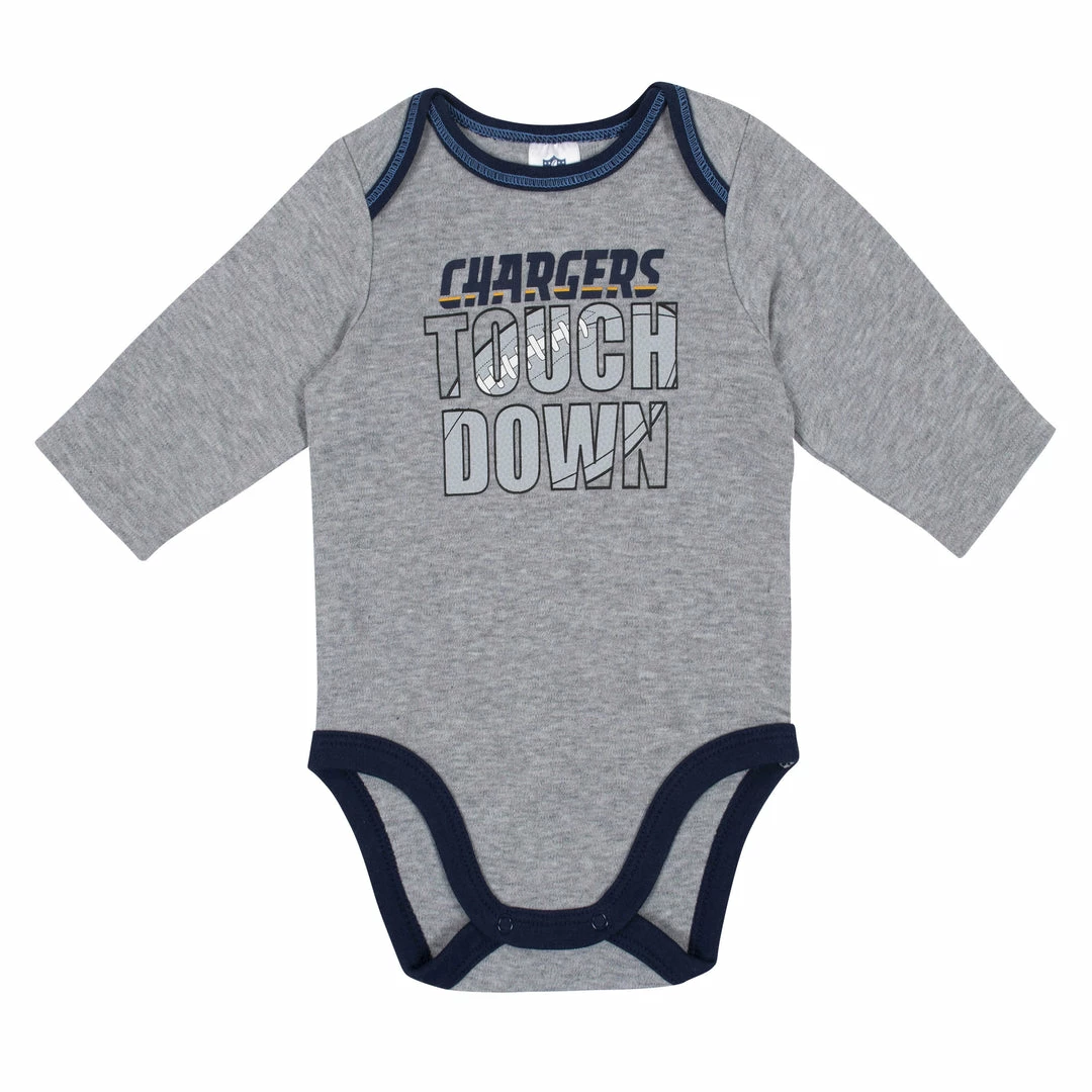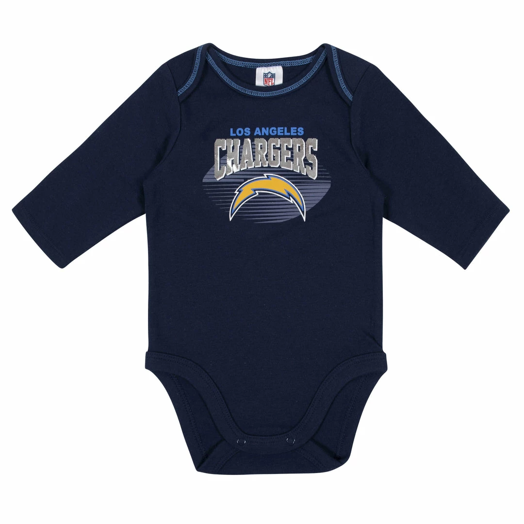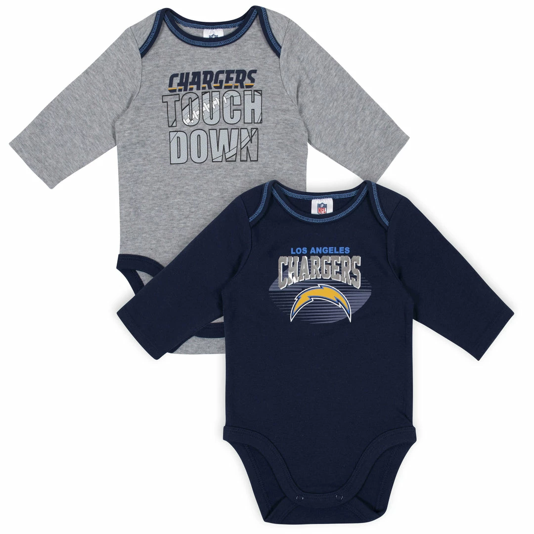 Get your little boy ready to take the field with this baby boys’ officially licensed Los Angeles Chargers long sleeve bodysuit 2-pack set! Gridiron-inspired screenprint with contrast coverstitch frames the Chargers logo to perfection. The cotton/poly blend interlock ensures he’s feeling his best from the opening kickoff to the final seconds of the game. An expandable lap shoulder neckline makes it easy for mom to dress him out on game days. A higher-in-the-front bottom snap closure simplifies diaper duty. Laundry day stays hassle-free with these easy care items!
