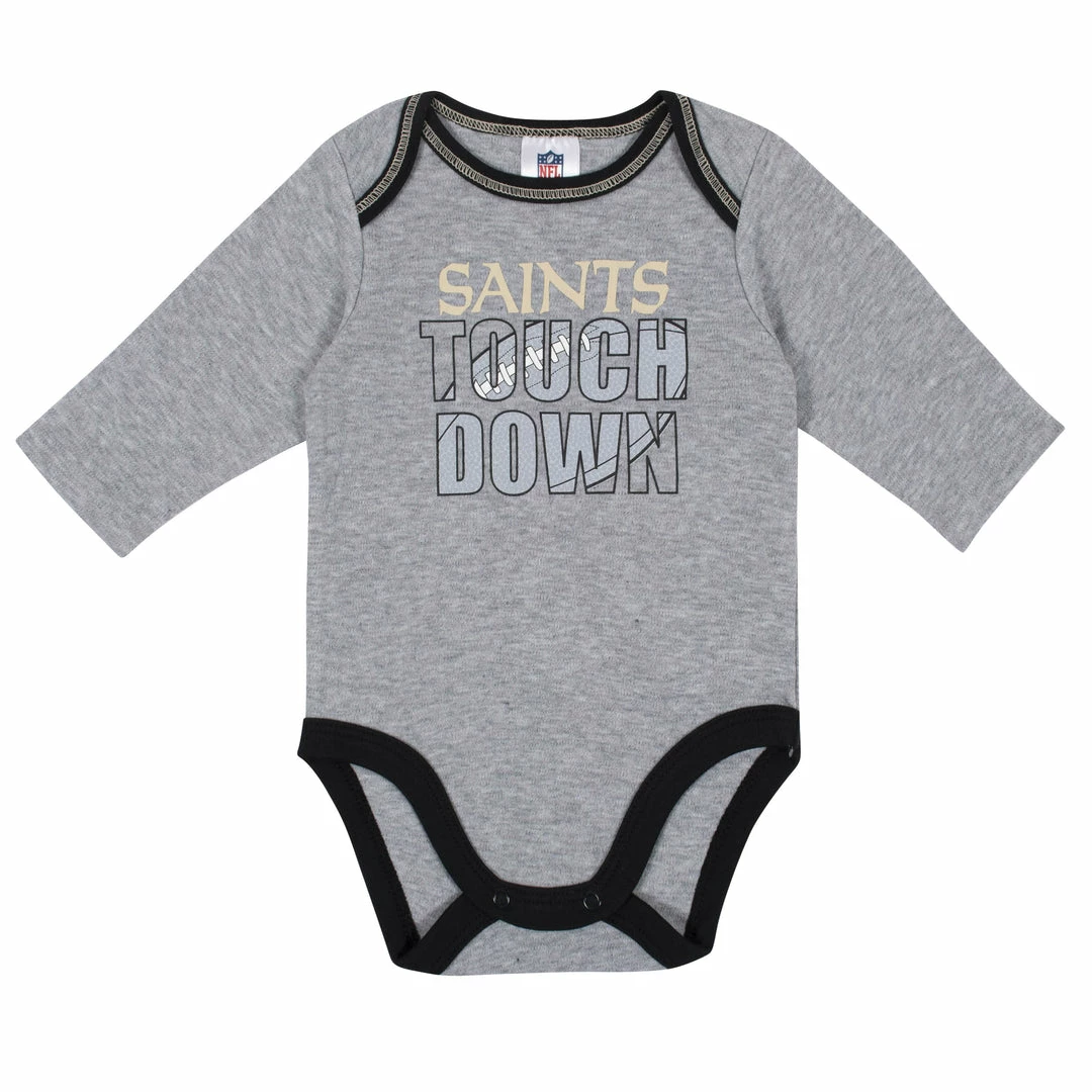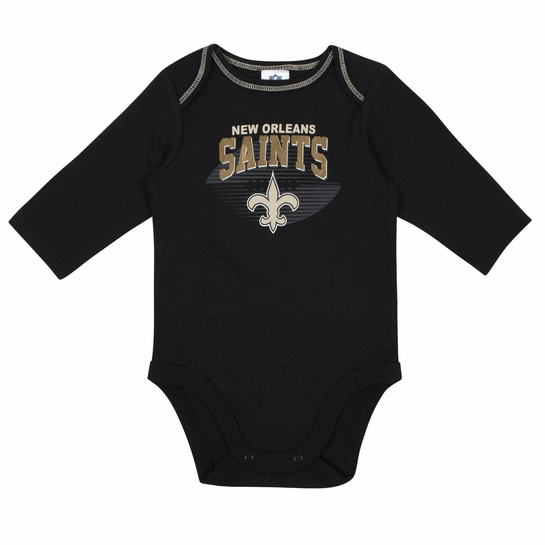 Get your little boy ready to take the field with this baby boys’ officially licensed New Orleans Saints long sleeve bodysuit 2-pack set! Gridiron-inspired screenprint with contrast coverstitch frames the Saints logo to perfection. The cotton/poly blend interlock ensures he’s feeling his best from the opening kickoff to the final seconds of the game. An expandable lap shoulder neckline makes it easy for mom to dress him out on game days. A higher-in-the-front bottom snap closure simplifies diaper duty. Laundry day stays hassle-free with these easy care items!
