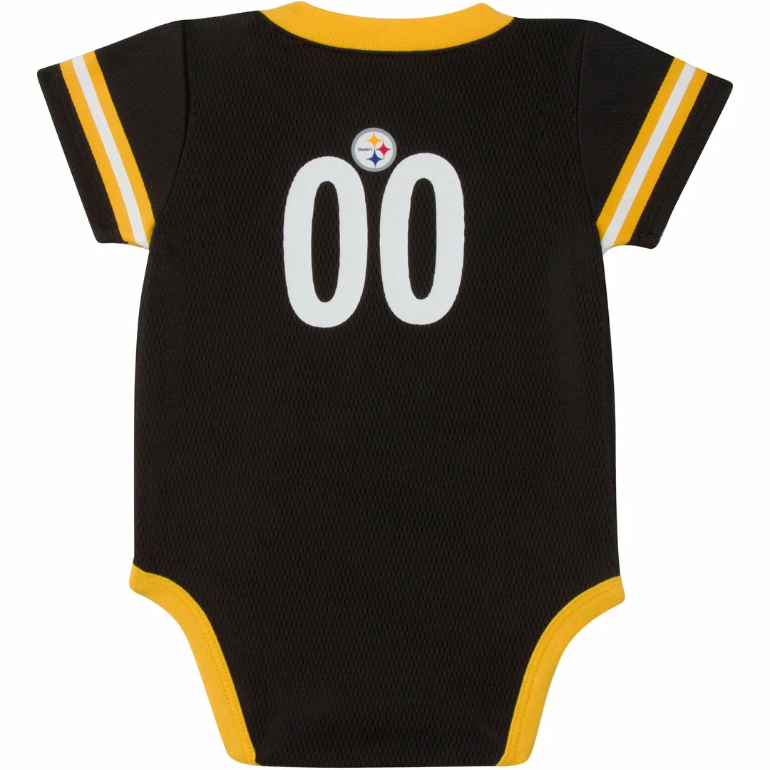 Get your little first round draft pick ready for the pros with this baby boys’ officially licensed Pittsburgh Steelers short sleeve jersey bodysuit! The 100% poly dazzle mesh and rib fabrics provide a cool, breathable feel. The Steelers logo is on proud display. Game day fun is guaranteed with this creative piece. Handy design features like the higher-in-the-front bottom snap closure makes diaper changes less work. Dressing him out is easier with the expandable lap shoulder neckline. Just toss these easy care items into the machine washer and dryer for hassle-free post-game clean up!
