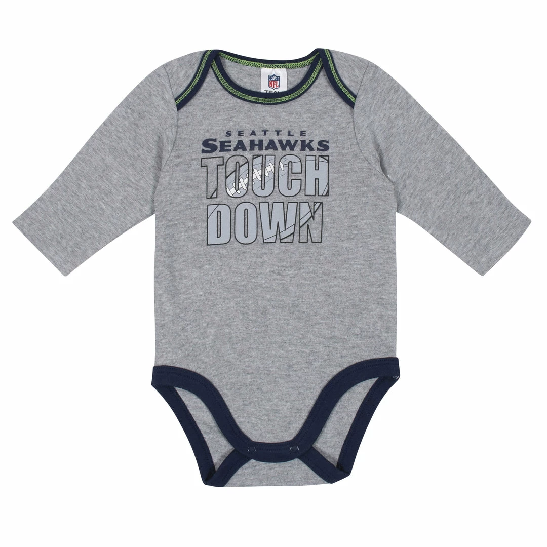 Get your little boy ready to take the field with this baby boys’ officially licensed Seattle Seahawks long sleeve bodysuit 2-pack set! Gridiron-inspired screenprint with contrast coverstitch frames the Seahawks logo to perfection. The cotton/poly blend interlock ensures he’s feeling his best from the opening kickoff to the final seconds of the game. An expandable lap shoulder neckline makes it easy for mom to dress him out on game days. A higher-in-the-front bottom snap closure simplifies diaper duty. Laundry day stays hassle-free with these easy care items!