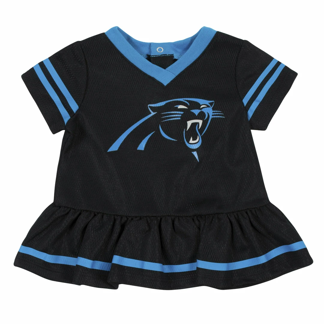 This baby girls’ officially licensed Carolina Panthers cheerleader dress and matching panty set won’t leave anybody wondering who she’s pulling for on game day! The 100% poly dazzle mesh and rib fabrics keep her feeling her best as she cheers on her favorite football team or gets ready to launch out on an everyday adventure. The Panthers logo is a standout on the dress with bold screenprint artwork and team colors showing proudly. There’s never a need to pamper this outfit when laundry day arrives. Just toss it into the washer and dryer with the rest of the easy care items!