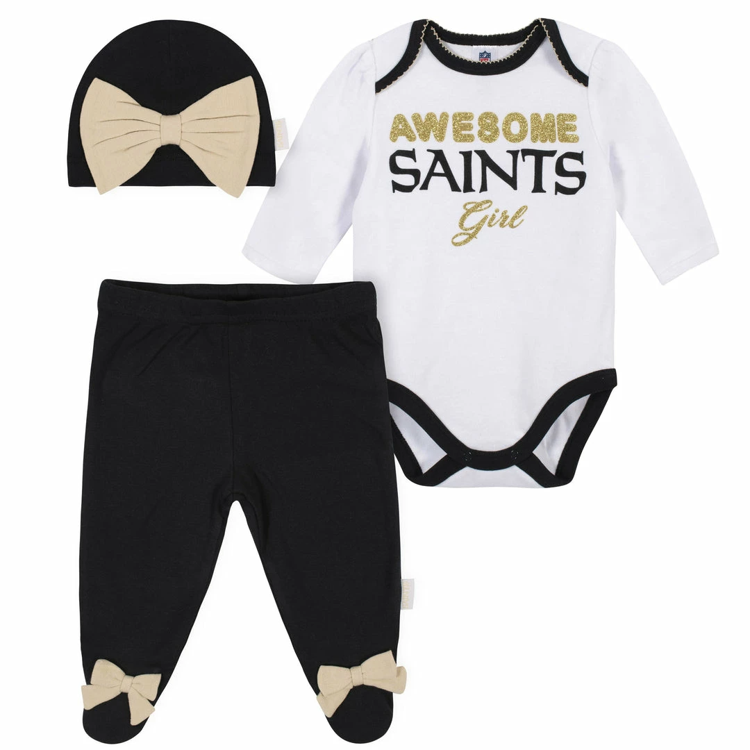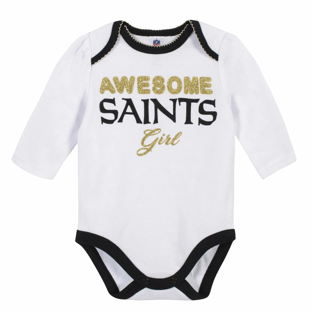 Get her ready for good times on the gridiron with this baby girls’ officially licensed New Orleans Saints 3-piece set! With this collection, you’ll receive one long sleeve bodysuit, pants, and a matching cap. The Saints logo stands out on the bodysuit with festive glitter screenprint and a woven label. She’ll bring everyone smiles on game day with this creative outfit! Mom will appreciate the convenience of the higher-in-the-front bottom snap closure that keeps diaper duty nice and simple. A gentle elastic waistband on the pants provides a more comfortable fit for active little girls. Whether she’s gathered around the big screen rooting for the family favorite or headed out for a shopping run with mom, the cotton blend interlock fabric will keep her feeling comfortable. There’s never any special treatment required when washing and drying these easy care pieces!