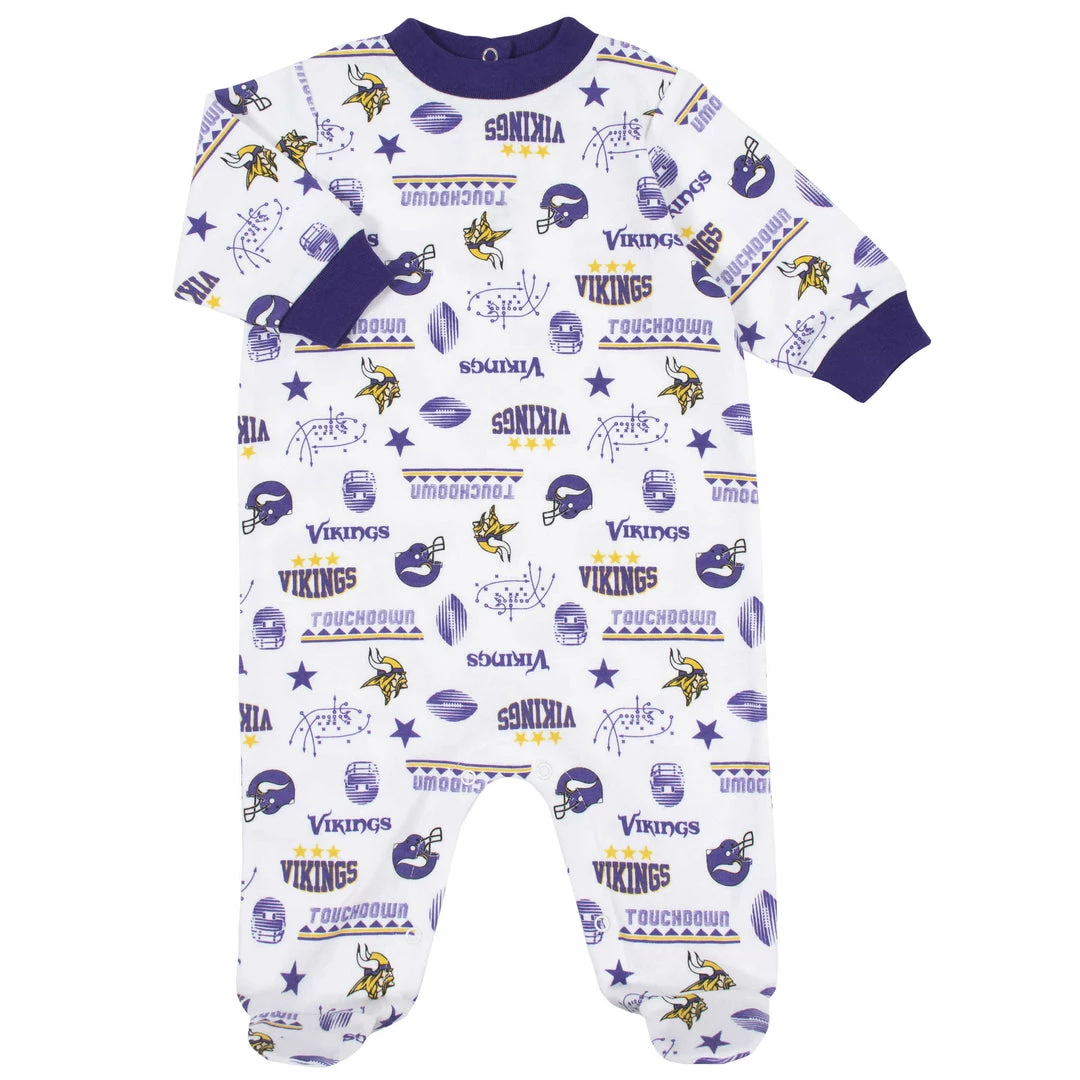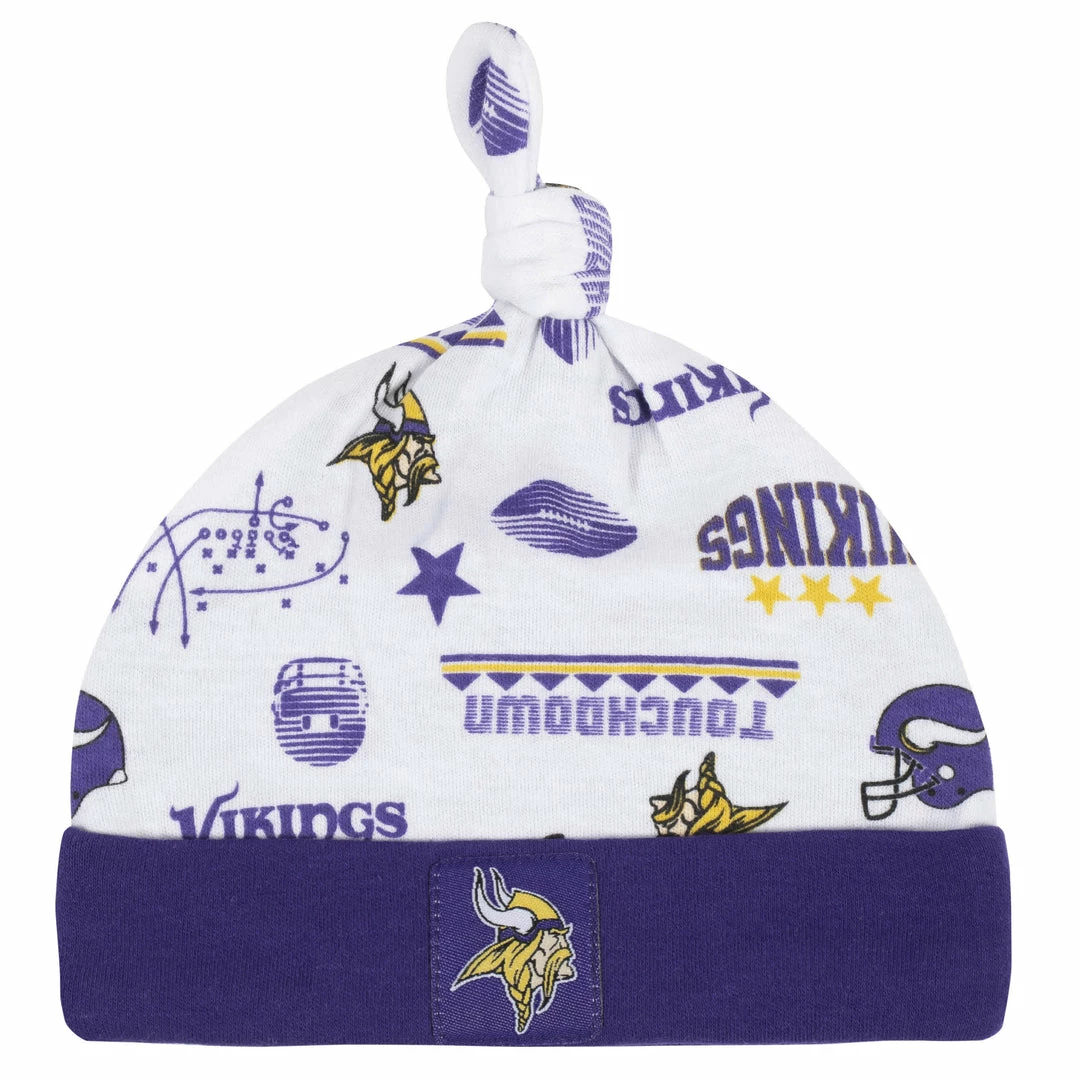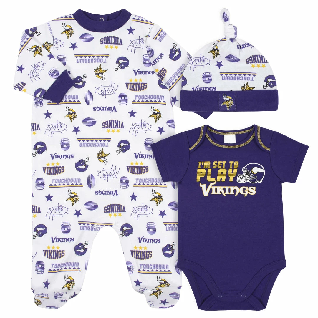 Boast your baby’s Vikings pride with this 3-piece bodysuit, Sleep ‘n Play, and cap set! This officially licensed NFL outfit is made with a soft cotton and polyester interlock to keep baby comfortable and content all game long. The bodysuit features an expandable lap shoulder neckline with high-positioned bottom snaps to keep changes quick and simple. It also has a bright and bold, screenprint team logo front and center. The Sleep ‘n Play boasts a colorful print of your team’s logos and helmets and features inner thigh snaps and a back placket for comfort and convenience. The knotted cap features a soft cuff for comfort and will keep your little one snuggly warm in cool weather This outfit is machine washable and dryable. It includes one bodysuit, one cap, and one Sleep ‘n Play.