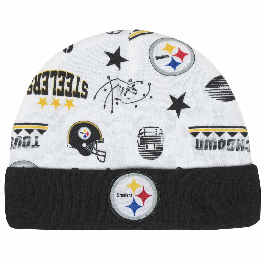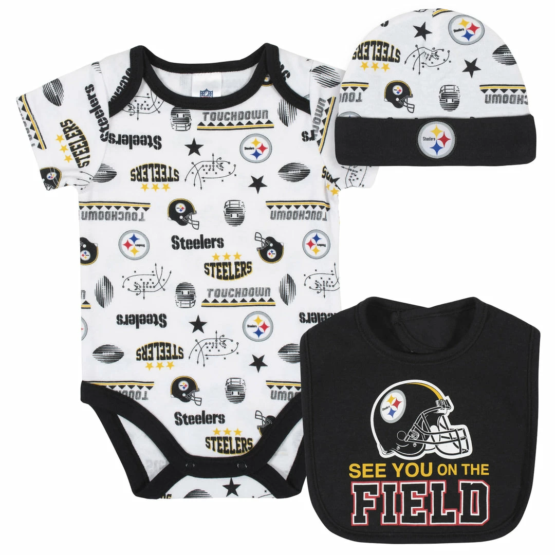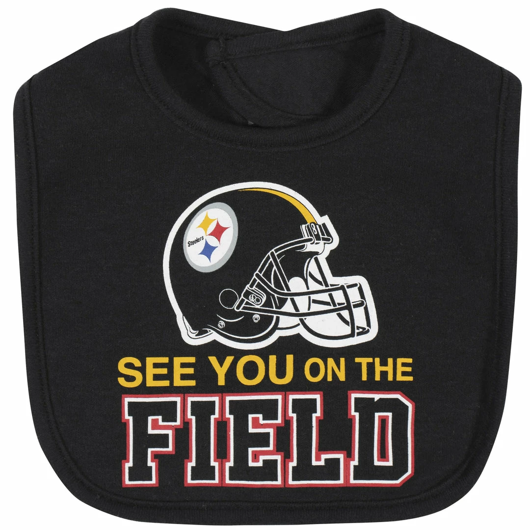 Let your baby’s Steelers pride shine with this bodysuit, pant, and cap set! This officially licensed NFL outfit is made with a soft cotton and polyester interlock to keep baby comfortable and content all game long. The bodysuit features an expandable lap shoulder neckline with high-positioned bottom snaps to keep changes quick and simple. The bodysuit boasts a colorful print of your team’s logos and helmets. The cap features a soft cuff for comfort and will keep your little one snuggly warm in cool weather. The bib has a soft hook and loop fastener for comfort and sports a bright and bold screenprint team logo front and center. This outfit is machine washable and dryable, so cleaning any game-time spills is easier than ever. This NFL baby outfit includes one short sleeve bodysuit, one cap, and one bib.