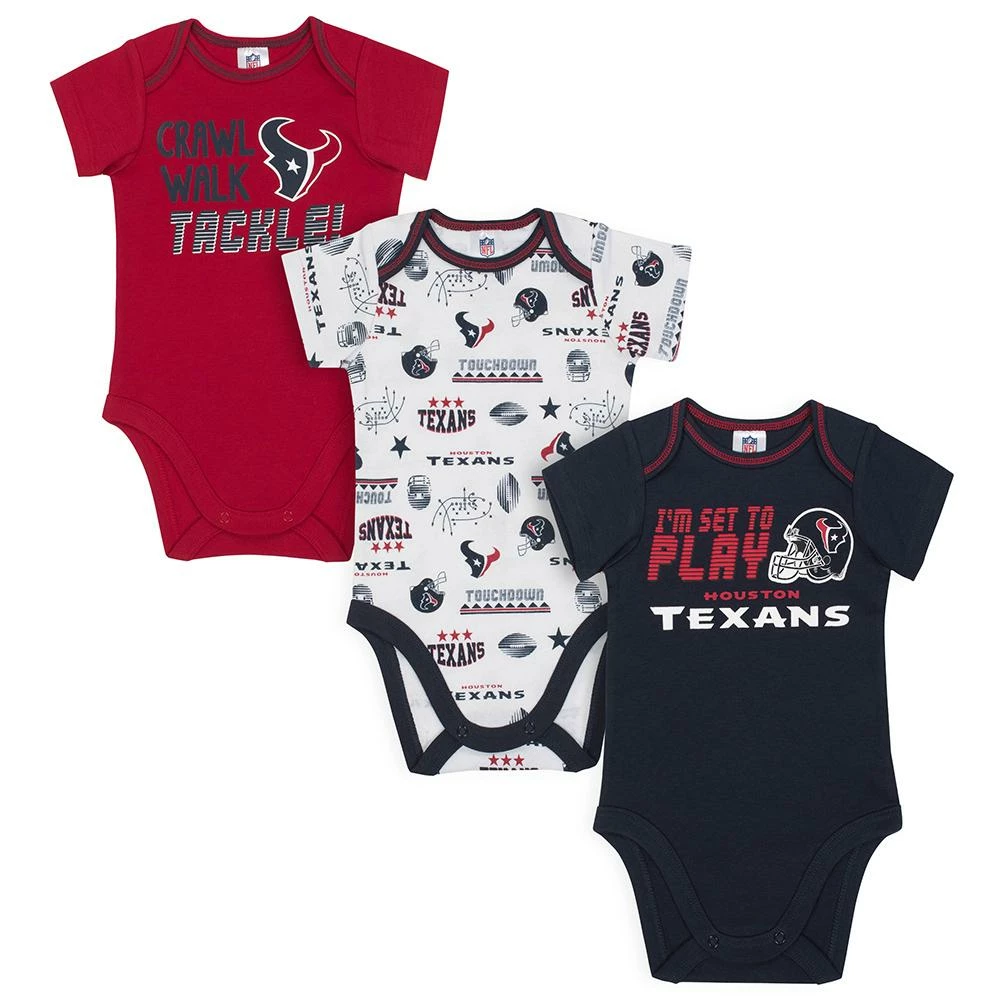 Prepare your little pint-sized all star for game day with this Houston Texans baby boys’ short sleeve bodysuit 3-pack set! The screenprint with puff and contrast coverstitch details proudly highlights the Texans logo. There will be no doubt about who your little boy is rooting for! The cotton/poly blend interlock provides a soft, comfy feel that keeps him at the top of his game as he represents your family’s favorite team. An expandable lap shoulder neckline makes pulling the bodysuit over his head easy for mom. The bodysuit’s higher-in-the-front bottom snap closure keeps diaper duty simple. These items are easy to clean with the machine wash and dry fabric!