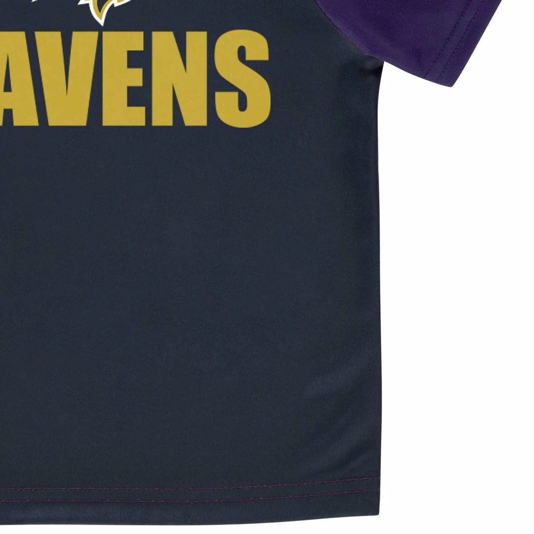 Come on, Ravens! Get the smallest family members ready to cheer with our officially licensed NFL baby tees. This product contains Repreveยฎ polyester made from recycled plastic bottles (or recycled content). Products made with Repreve help to conserve energy and natural resources. And, gives you another great reason to recycle. The tee features a comfy, casual crew neck to keep your little one comfortable throughout the entirety of the game (and the whole day long!). The screen print team logo is bright and bold and is featured front and center on the t-shirt. Itโs the perfect tee for warm game days and cool games days, as it may be worn comfortably all on its own or layered over to keep warm. This t-shirt is machine washable to take care of any game-time spills.
