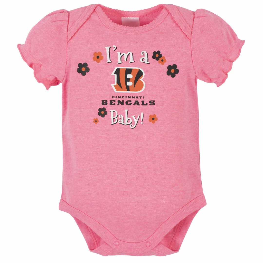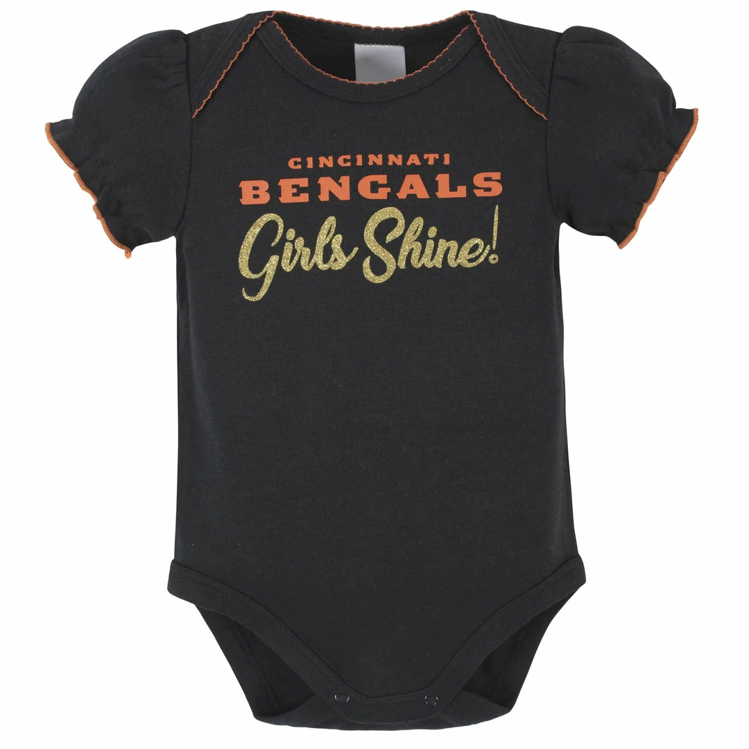 Get your little one in the game with our officially licensed NFL bodysuits! These Bengals bodysuits will keep your comfy throughout the entire game (and day!). The bodysuits feature expandable lap shoulder necklines to keep changes comfortable and quick. They feature a variety of designs and patterns that show off ’s team pride. The bottom snaps are positioned for convenient diaper changes, so taking breaks from the game don’t last longer than they need to. These girls’ bodysuits are a great choice for warm or cool game days, as they may be layered over or worn all on their own. They’re also machine washable for your convenience.