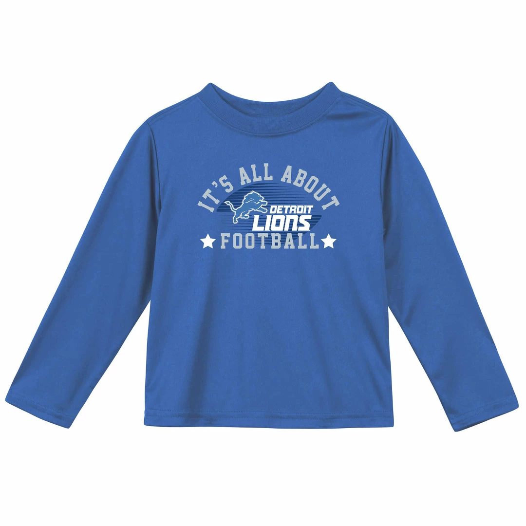 Come on, Lions! Get the smallest family members ready to cheer with our officially licensed NFL long sleeve toddler tee. This product contains Repreveยฎ polyester made from recycled plastic bottles (or recycled content). Products made with Repreve help to conserve energy and natural resources. And, gives you another great reason to recycle. The tee features a comfy, casual crew neck to keep your little one comfortable throughout the entirety of the game (and the whole day long!). The screen print team logo is bright and bold and is featured front and center on the t-shirt. This t-shirt is machine washable to take care of any game-time spills.