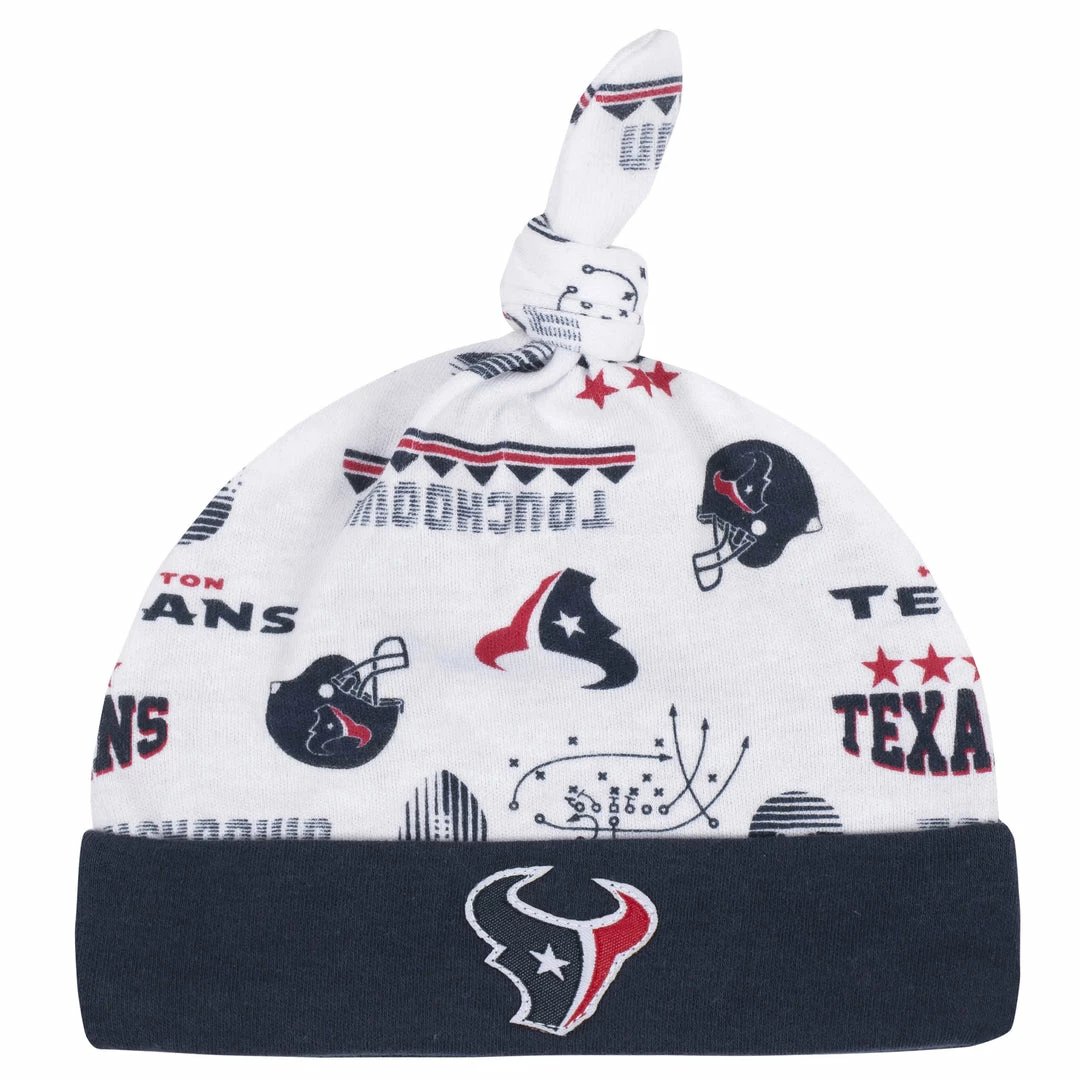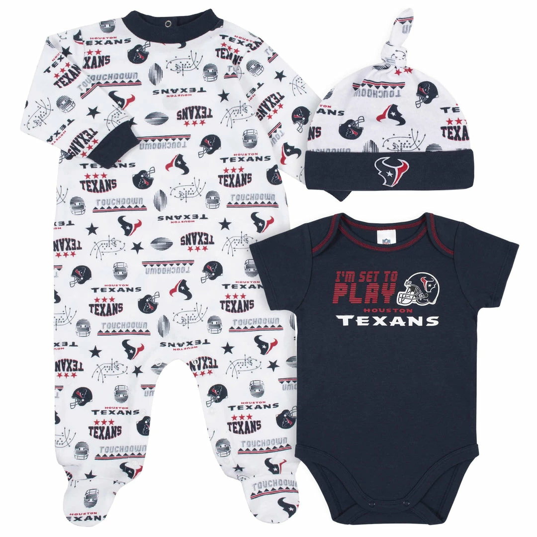 Boast your baby’s Texans pride with this 3-piece bodysuit, Sleep ‘n Play, and cap set! This officially licensed NFL outfit is made with a soft cotton and polyester interlock to keep baby comfortable and content all game long. The bodysuit features an expandable lap shoulder neckline with high-positioned bottom snaps to keep changes quick and simple. It also has a bright and bold, screenprint team logo front and center. The Sleep ‘n Play boasts a colorful print of your team’s logos and helmets and features inner thigh snaps and a back placket for comfort and convenience. The knotted cap features a soft cuff for comfort and will keep your little one snuggly warm in cool weather This outfit is machine washable and dryable. It includes one bodysuit, one cap, and one Sleep ‘n Play.