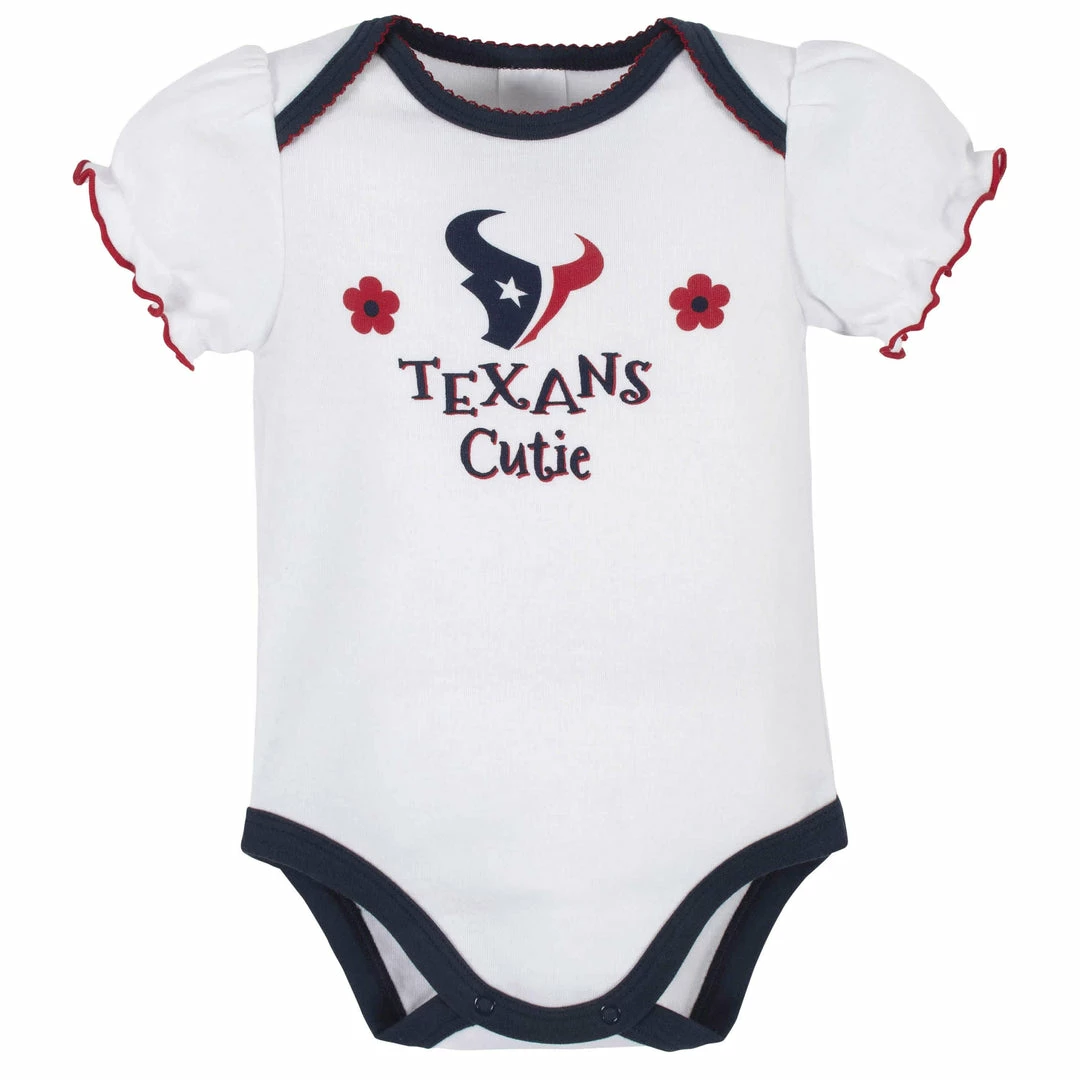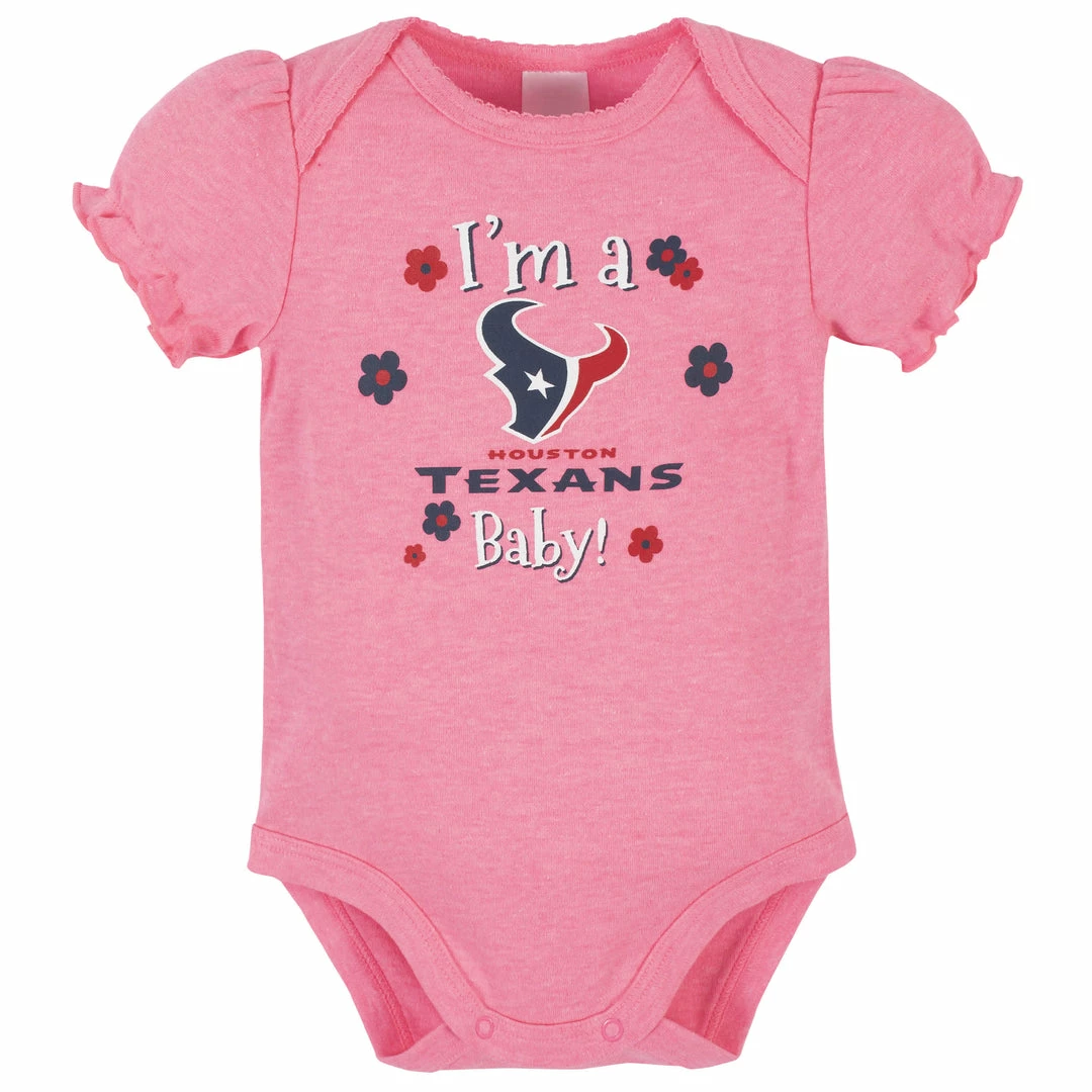 Get your little one in the game with our officially licensed NFL bodysuits! These Texans bodysuits will keep your comfy throughout the entire game (and day!). The bodysuits feature expandable lap shoulder necklines to keep changes comfortable and quick. They feature a variety of designs and patterns that show off ’s team pride. The bottom snaps are positioned for convenient diaper changes, so taking breaks from the game don’t last longer than they need to. These girls’ bodysuits are a great choice for warm or cool game days, as they may be layered over or worn all on their own. They’re also machine washable for your convenience.