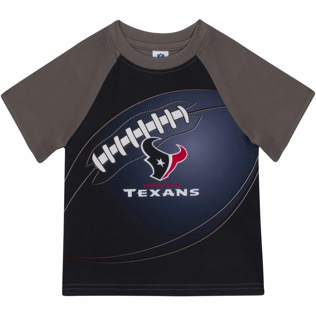 Add a fun new shirt to your little boy’s collection with this Houston Texans boys’ short sleeve tee shirt! It’s in style on game day or any day you’re in the mood for some creative football-inspired artwork! The Texans logo stands out boldly. Whether you pair this tee with some shorts or long pants, he’ll be proudly representing the winning team. The comfy, 100% poly interlock fabric feels soft and soothing on his skin. Cleaning is quick and simple with the machine wash and dry fabric!
