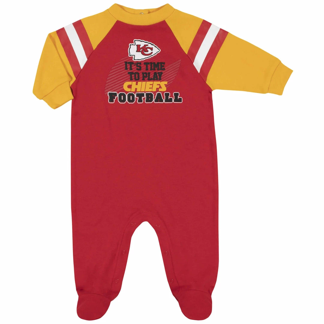 Support the Chiefs day and night with this pair of officially licensed footed pajamas for ! This Sleep ‘n Play features inner thigh snaps that will keep changing time quick and simple, so when the game’s on, you’ll be back in a flash. These pajamas also feature a back placket to let the garment slip over ’s head with ease and comfort. This Sleep ‘n Play features a bright and bold screenprinted team logo on the front of the outfit. It’s the perfect outfit to wear day or night, especially when it’s chilly outside. Taking to the game with you? Bundle them up by layering underneath the outfit as well as on top for maximum warmth and comfort. Plus, this outfit is footed which means no fooling around with socks! This Sleep ‘n Play is machine washable and dryable.