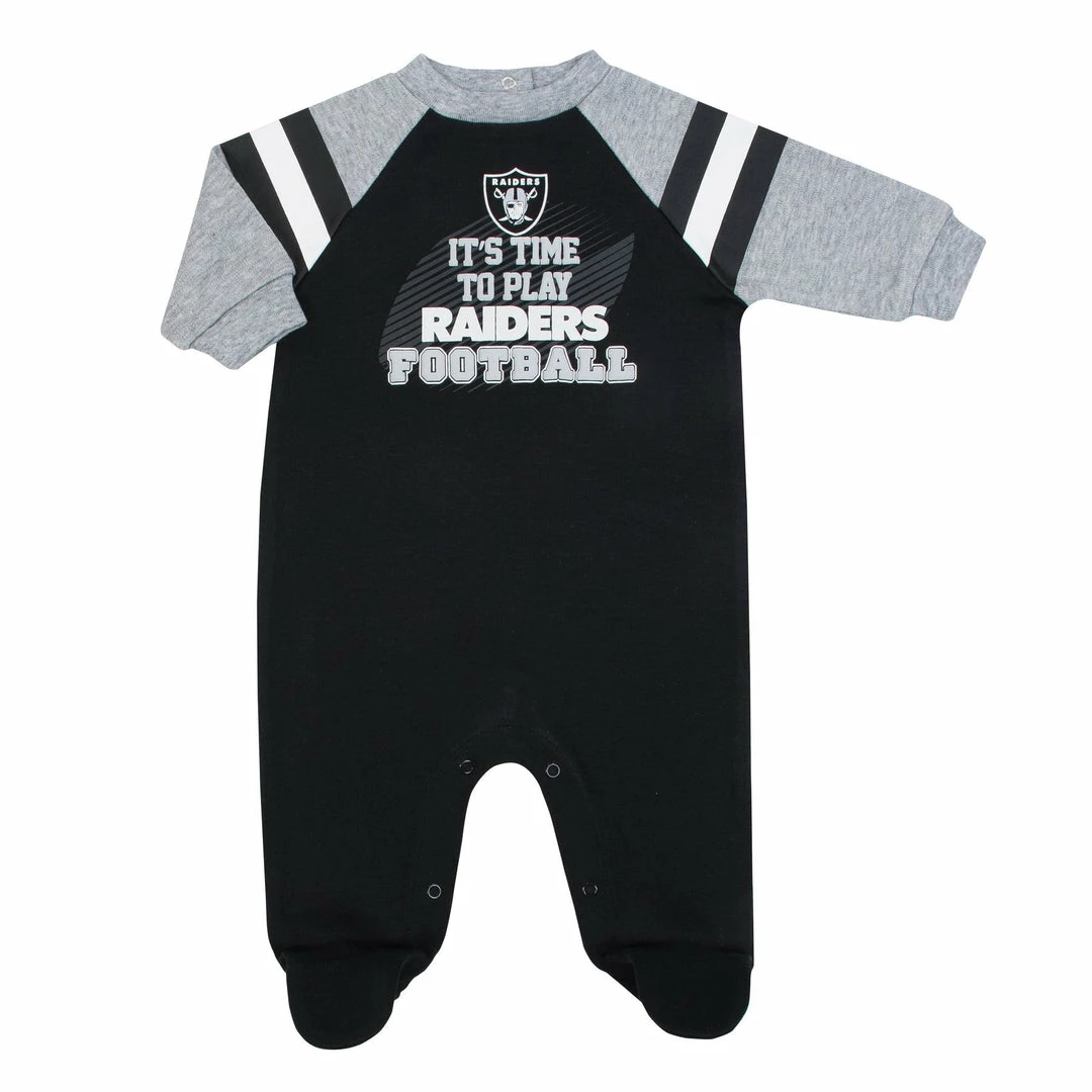 From the coin toss to the final seconds of the game, this Oakland Raiders baby boys’ Sleep N’ Play keeps him in the middle of all of the excitement! Screenprint with puff details puts the Raiders logo front and center. The soft, cozy cotton blend interlock and rib fabrics provide a comfy fit that keeps him feeling good whether he’s getting some pregame shuteye or romping around during halftime. A front zipper opening makes it easy for mom to dress him out. The soft fabric zipper cover keeps his chin free from scratches. Machine wash and dry fabric makes cleaning up quick and simple!