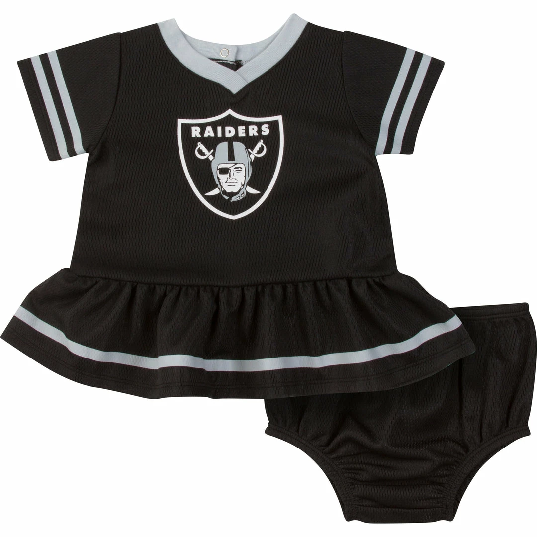 This baby girls’ officially licensed Oakland Raiders cheerleader dress and matching panty set won’t leave anybody wondering who she’s pulling for on game day! The 100% poly dazzle mesh and rib fabrics keep her feeling her best as she cheers on her favorite football team or gets ready to launch out on an everyday adventure. The Raiders logo is a standout on the dress with bold screenprint artwork and team colors showing proudly. There’s never a need to pamper this outfit when laundry day arrives. Just toss it into the washer and dryer with the rest of the easy care items!