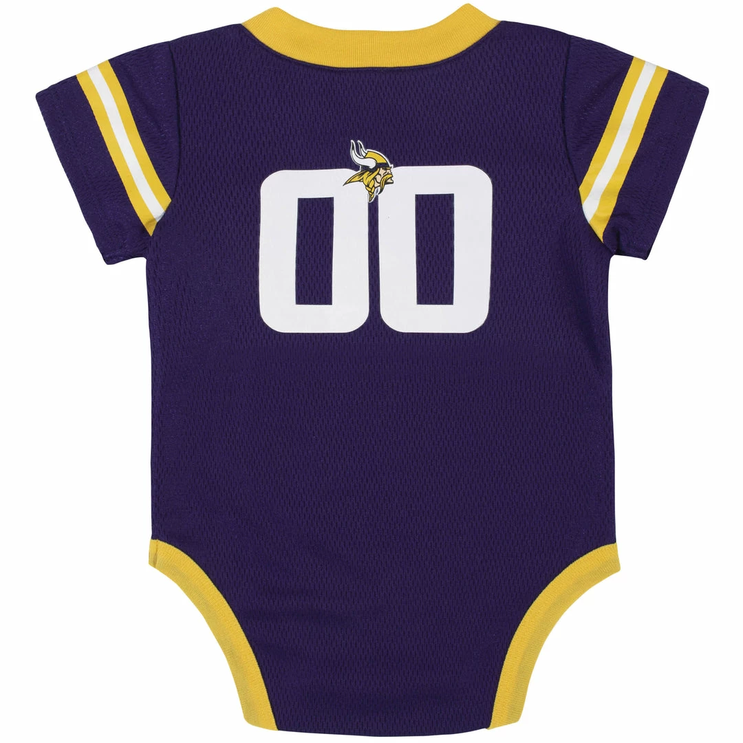 This officially licensed NFL bodysuit is the perfect first Vikings “jersey” for your little one! Your will stay comfy throughout the entire game (and day!) in the polyester mesh fabric of this NFL bodysuit. The bodysuit features a V-neck with a shoulder placket to keep changes comfortable and quick. The bodysuit also features jersey numbers on the back and a team logo front and center to show off ’s team pride. The bottom snaps are positioned for convenient diaper changes, so taking breaks from the game won’t last long. This boys’ bodysuit is a great choice for warm or cool game days, as it may be layered over or worn all on its own. This bodysuit is machine washable for your convenience.