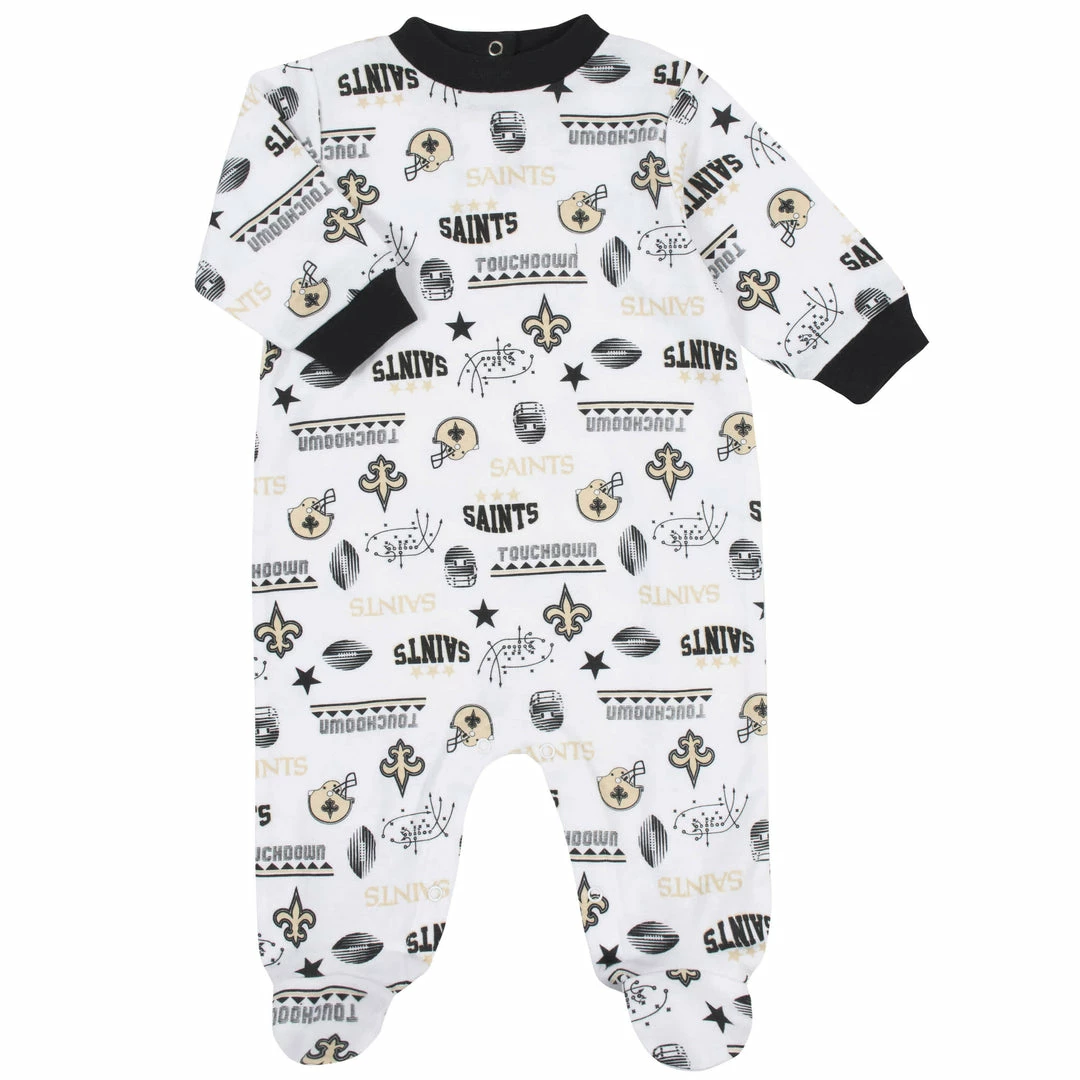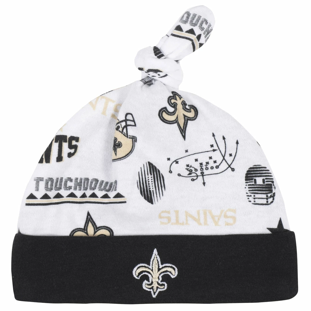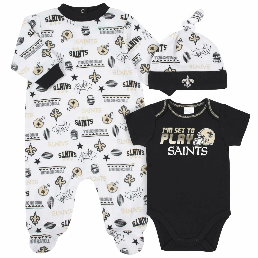 Boast your baby’s Saints pride with this 3-piece bodysuit, Sleep ‘n Play, and cap set! This officially licensed NFL outfit is made with a soft cotton and polyester interlock to keep baby comfortable and content all game long. The bodysuit features an expandable lap shoulder neckline with high-positioned bottom snaps to keep changes quick and simple. It also has a bright and bold, screenprint team logo front and center. The Sleep ‘n Play boasts a colorful print of your team’s logos and helmets and features inner thigh snaps and a back placket for comfort and convenience. The knotted cap features a soft cuff for comfort and will keep your little one snuggly warm in cool weather This outfit is machine washable and dryable. It includes one bodysuit, one cap, and one Sleep ‘n Play.