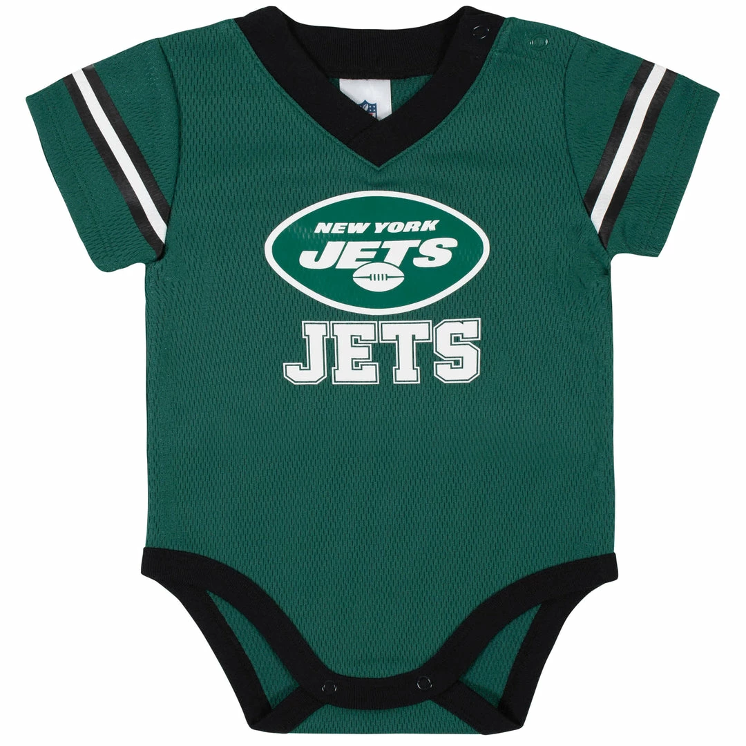 This officially licensed NFL bodysuit is the perfect first Jets “jersey” for your little one! Your will stay comfy throughout the entire game (and day!) in the polyester mesh fabric of this NFL bodysuit. The bodysuit features a V-neck with a shoulder placket to keep changes comfortable and quick. The bodysuit also features jersey numbers on the back and a team logo front and center to show off ’s team pride. The bottom snaps are positioned for convenient diaper changes, so taking breaks from the game won’t last long. This boys’ bodysuit is a great choice for warm or cool game days, as it may be layered over or worn all on its own. This bodysuit is machine washable for your convenience.
