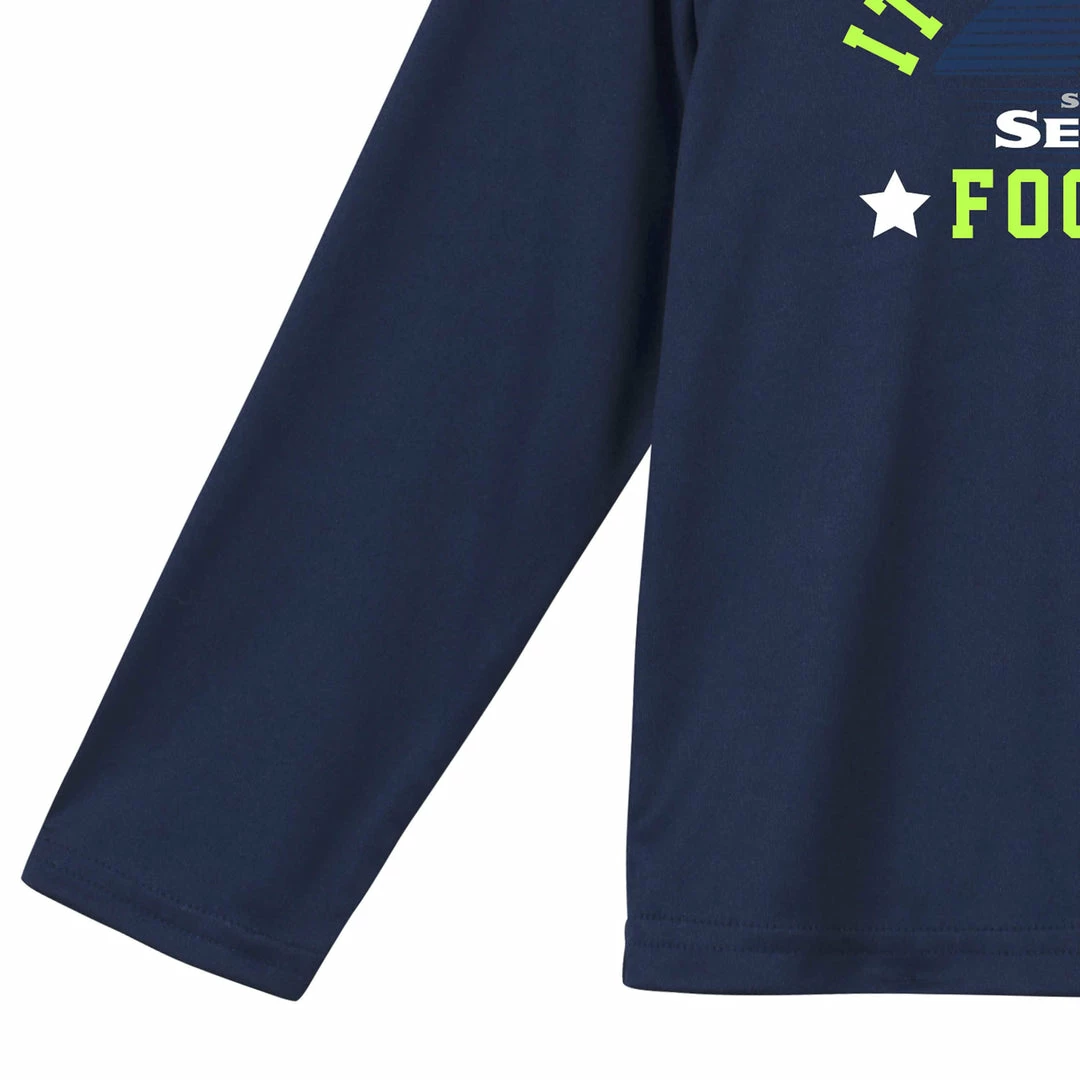 Come on, Seahawks! Get the smallest family members ready to cheer with our officially licensed NFL long sleeve tee. This product contains Repreveยฎ polyester made from recycled plastic bottles (or recycled content). Products made with Repreve help to conserve energy and natural resources. And, gives you another great reason to recycle. The tee features a comfy, casual crew neck to keep your little one comfortable throughout the entirety of the game (and the whole day long!). The screen print team logo is bright and bold and is featured front and center on the t-shirt. This t-shirt is machine washable to take care of any game-time spills.
