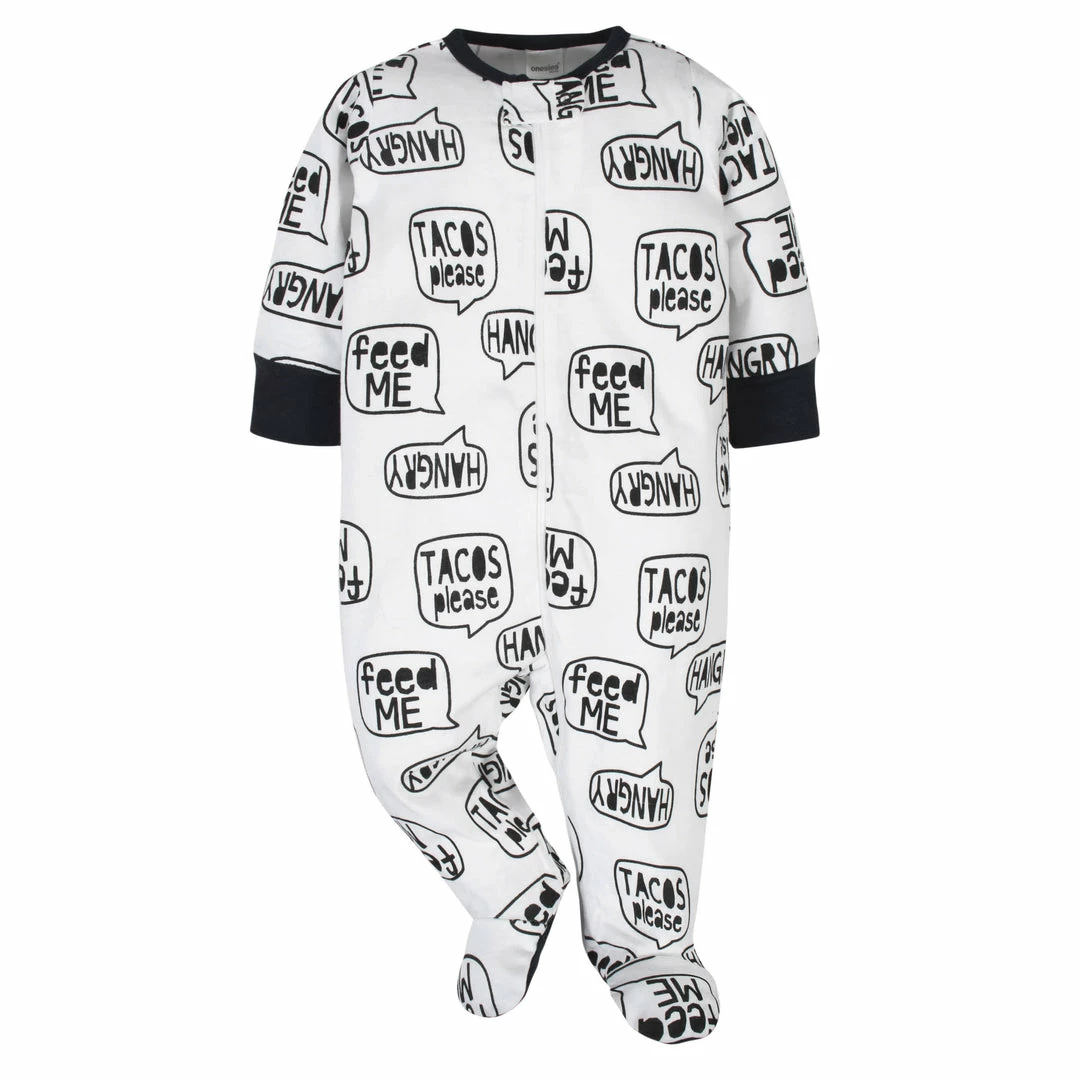 The handsome stripe designs and Taco prints make these baby clothes a great gift, especially for new parents! These Sleep ‘n Plays are machine washable and machine dryable. This pack includes four Onesies® Brand Sleep ‘n Plays: Stripes, Taco, Hungry, and Modern Stripes.