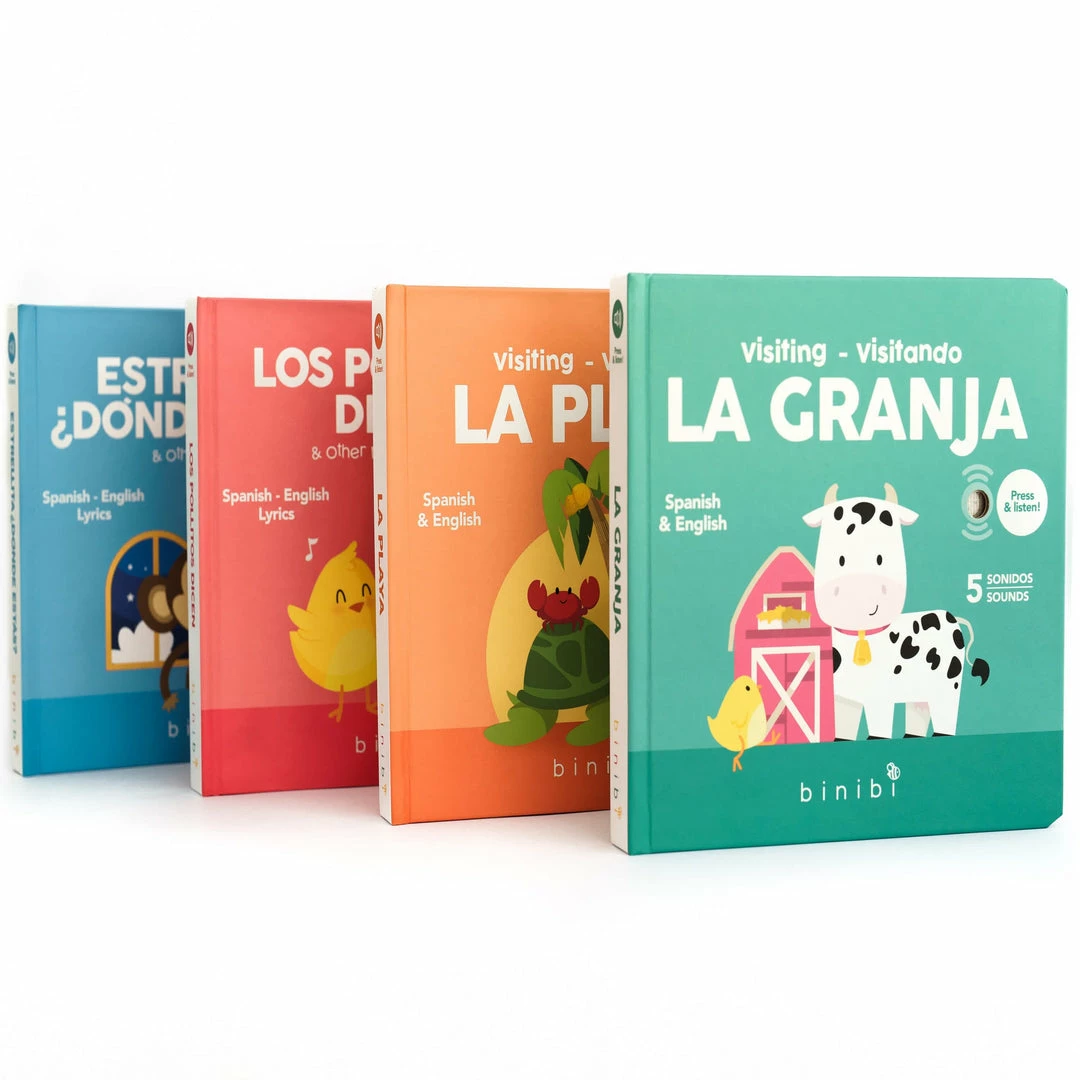 Binibi books are the perfect way to support your baby’s bilingual journey. Through sounds, songs, and bilingual starting phrases, you will help your child take the first step towards Spanish – English bilingualism. Press, listen, and learn!